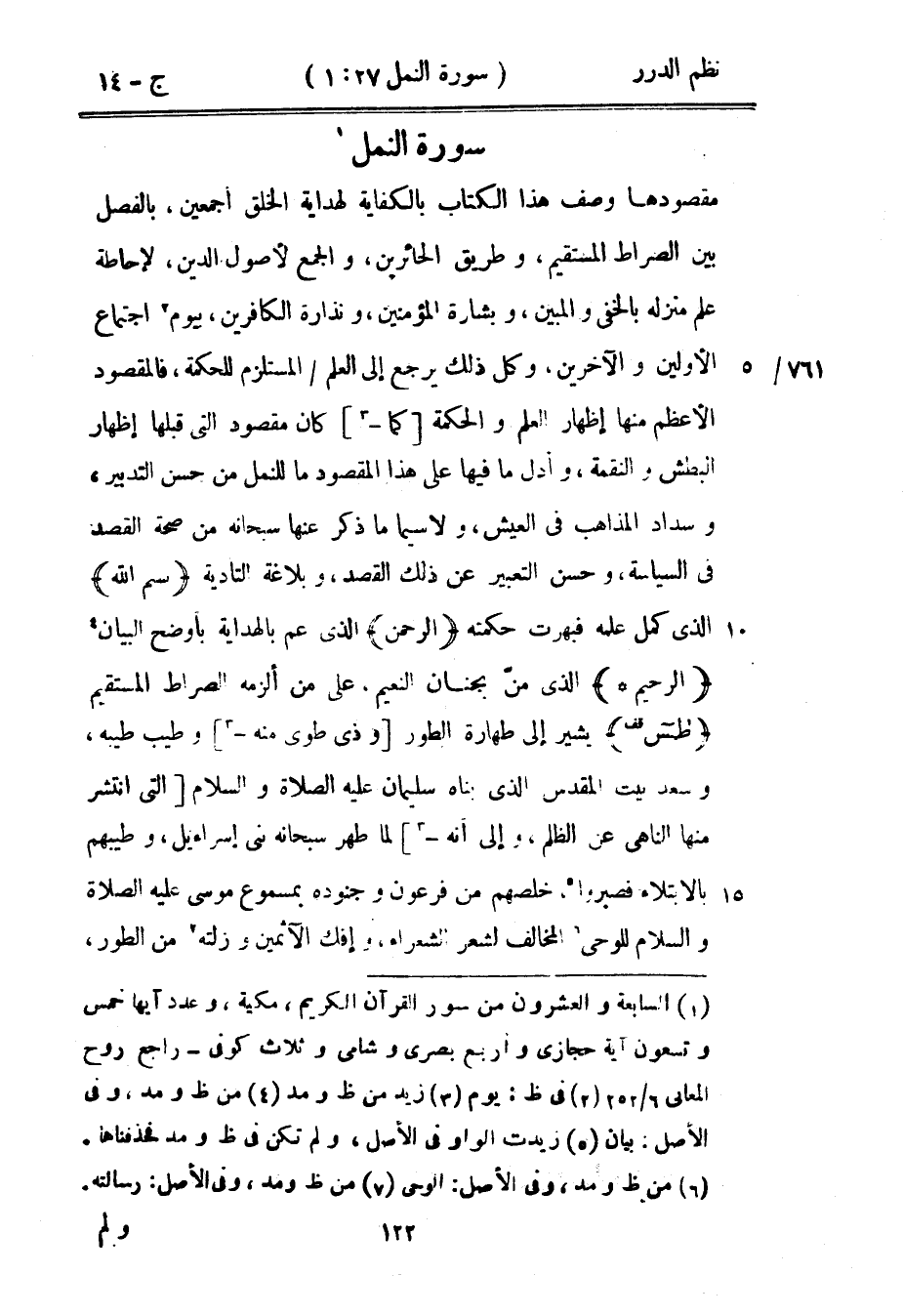 مقصودها وصف هذا الكتاب بالكفاية لهداية الخلق أجمعين، بالفصل بين الصراط المستقيم، وطريق الحائرين، والجمع لأصول الدين، لإحاطة علم منزله بالخفي والمبينن وبشارة المؤمنين، ونذارة الكافرين، بيوم احتماع الأولين والآخرين، وكل ذلك يرجع إلى العلم المستلزم للحكمة، فالمقصود الأعظممنها إظهار العلم والحكمة كما كان مقصود التي قبلها إظهار البطش والنقمة، وأدل ما فيها على هذا المقصود ما للنمل من حسن التدبير، وسداد المذاهب في العيش، ولا سيما ما ذكر عنها سبحانه من صحة القصد في السياسة، وحسن التعبير عن ذلك القصد، وبلاغة التأدية) بسم الله (الذي كمل علمه فبهرت حكمته) الرحمن (الذي عم بالهداية بأوضح البيان) الرحيم (الذي منّ بجنان النعيم.
