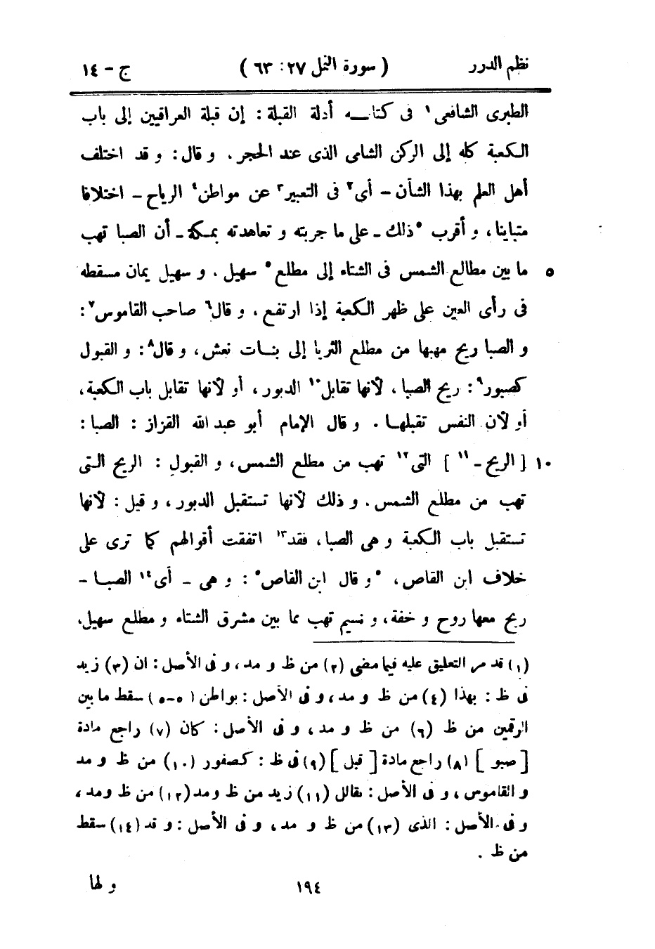 الطبري الشافعي في كتابه أدلة القبلة: إن قبلة العراقيين إلى باب الكعبة كله إلى الركن الشامي الذي عند الحجر، وقال: وقد اختلف أهل العلم بهذا الشأن - أي في التعبير عن مواطن الرياح - اختلافاً متبايناً، وأقرب ذلك - على ما جربته وتعاهدته بمكة - أن الصبا تهب ما بين مطالع الشمس في الشتاء إلى مطلع سهيل، وسهيل يمان مسقطه في رأي العين على ظهر الكعبة إذا ارتفع، وقال صاحب القاموس: والصبا ريح مهبها من مطلع الثريا إلى بنات نعش، وقال: والقبول كصبور: ريح الصبا، لأنها تقابل الدبور، أو لأنها تقابل باب الكعبة، أو لأن النفس تقلبها. وقال الإمام أبو عبد الله القزاز: الصبا: الريح التي تهب من مطلع الشمس، والقبول: الريح التي تهب من مطلع الشمس، وذلك لأنها تستقبل الدبور، وقيل: لأنها تستقبل باب الكعبة وهي الصبا، فقد اتفقت أقولهم كما ترى على خلاف ابن القاص، وقال ابن القاص: وهي - أي الصبا - ريح معها روح وخفة، ونسيم تهب مما بين مشرق الشتاء ومطلع سهيل،