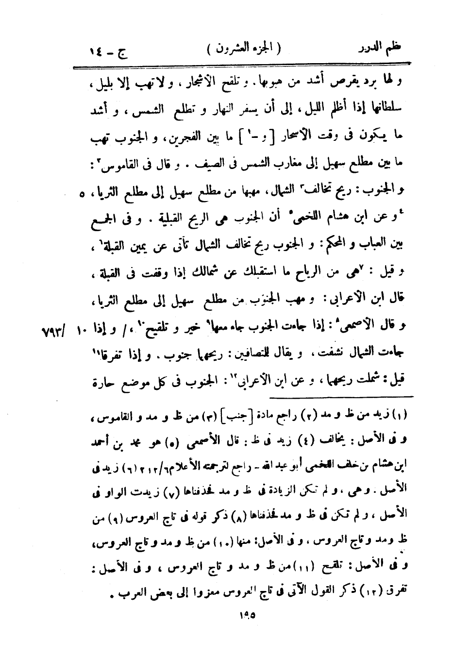 ولها برد يقرص أشد من هبوبها، وتلقح الأشجار، ولا تهب إلا بليل، سلطانها إذا أظلم الليل، إلى أن يسفر النهار وتطلع الشمس، وأشد ما يكون في وقت الأسحار وما بين الفجرين، والجنوب تهب ما بين مطلع سهيل إلى مغارب الشمس في الصيف. وقال في القاموس: والجنوب: ريح تخالف الشمال، مهبها من مطلع سهيل إلى مطلع الثريا، وعن ابن هشام اللخمي أن الجنوب هي الريح القبلية. وفي الجمع بين العباب والمحكم: والجنوب ريح تخالف الشمال تأتي عن يمين القبلة، وقيل: هي من الرياح ما استقبلك عن شمالك إذا وقفت في القبلة، قال ابن الأعرابي: ومهب الجنوب من مطلع سهيل إلى مطلع الثريا، وقال الأصمعي: إذا جاءت الجنوب جاء معها خير وتلقيح، وإذا جاءت الشمال نشفت، ويقال للمتصافيين: ريحهما جنوب، وإذا تفرقا قيل: شملت ريحهما، وعن ابن الأعرابي: الجنوب في كل موضع حارة