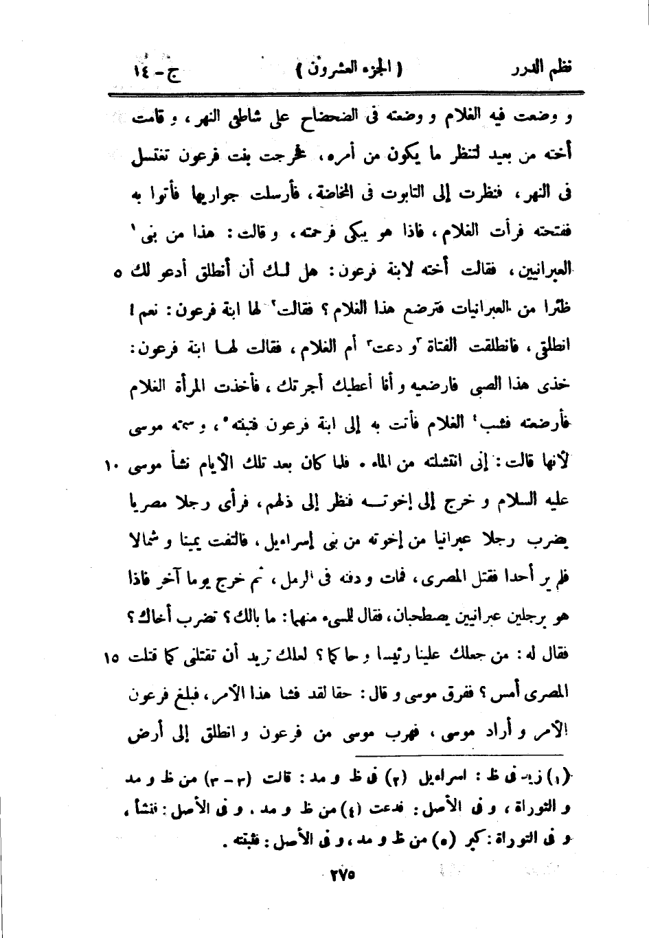 ووضعت فيه الغلام ووضعته في الضحضاح على شاطىء النهر، وقامت أخته من بعيد لتنظر ما يكون من أمره، فخرجت بنت فرعون تغتسل في النهر، فنظرت إلى التابوت في المخاضة، فأرسلت جواريها فأتوا به ففتحته فرأت الغلام، فإذا هو يبكي فرحمته، وقالت: هذا من بني العبرانيين، فقالت أخته لابنة فرعون: هل لك أن أنطلق أدعو لك ظئراً من العبرانيات فترضع هذا الغلام؟ فقالت لها ابنة فرعون: نعم! انطلقي، فانطلقت الفتاة ودعت أم الغلام، فقالت لها ابنة فرعون: خذي هذا الصبي فأرضعيه وأنا أعطيك أجرتك، فأخذت المرأة الغلام فأرضعته فشب الغلام فأتت به إلى ابنة فرعون فتبنته، وسمته موسى لأنها قالت: إني انتشلته من الماء.