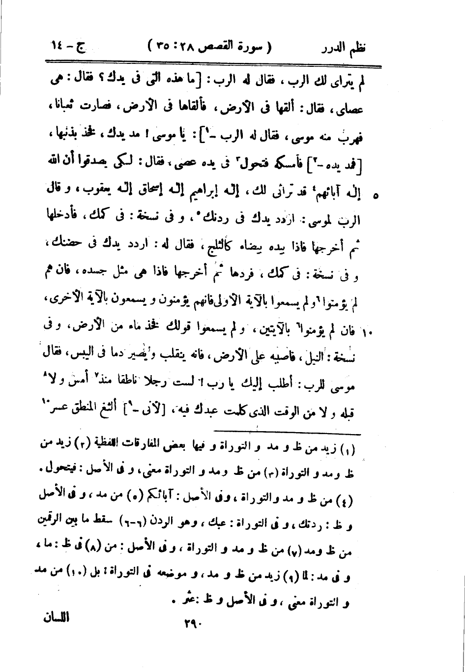 لم يتراءى لك الرب، فقال له الرب: ما هذه التي في يدك؟ فقال: هي عصاي، فقال: ألقها في الأرض، فألقاها في الأرض، فصارت ثعباناً، فهرب منه موسى، فقال له الرب: يا موسى! مد يدك، فخذ بذنبها، فمد يده فأمسكه فتحول في يده عصا، فقال: لكي يصدقوا أن الله إله آبائهم قد تراءى لك، إله إبراهيم إله إسحاق إله يعقوب، وقال الرب لموسى: اردد يدك في ردنك، وفي نسخة: في كمك، فأدخلها ثم أخرجها فإذ بيده بيضاء كالثلج، فقال له: اردد يدك في حضنك، وفي نسخة: في كمك، فردها ثم أخرجها فإذا هي مثل جسده، فإن هم لم يؤمنوا ولم يسمعوا بالآية الأولى فإنهم يؤمنون ويسمعون بالآية الأخرى، فإن لم يؤمنوا بالآيتين، ولم يسمعوا قولك فخذ ماء من الأرض، وفي نسخة: النيل، فاصببه على الأرض، فإنه ينقلب ويصير دماً في اليبس، فقال موسى للرب: أطلب إليك يا رب لست رجلاً ناطقاً منذ أمس ولا قبله ولا من الوقت الذي كلمت عبدك فيه، لأني ألثغ المنطق عسر