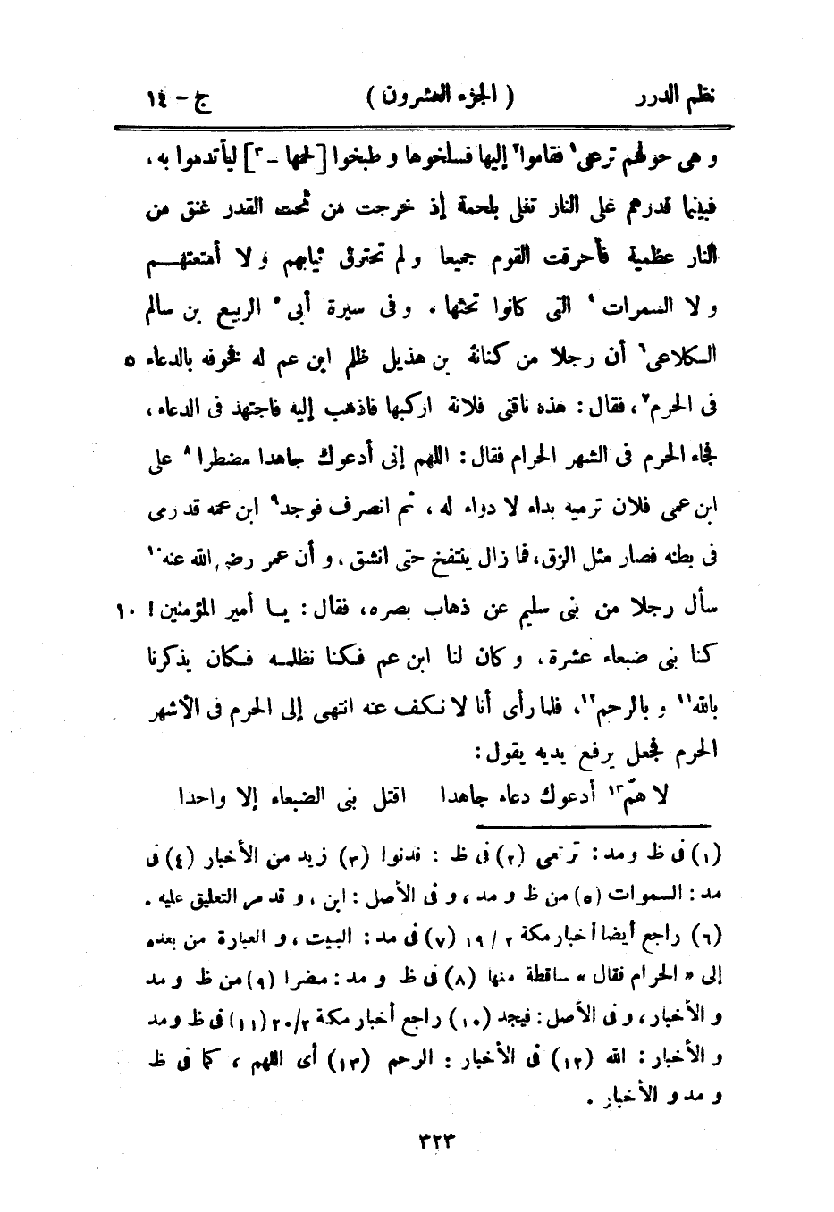 وفي سيرة أبي ربيع بن سالم الكلاعي أن رجلاً من كنانة بن هذيل ظلم ابن عم له فخوفه بالدعاء في الحرم، فقال: هذه ناقتي فلانة اركبها فاذهب إليه فاجتهد في الدعاء، فجاء الحرم في الشهر الحرام، فقال: اللهم إني ادعوك جاهداً مضطراً على ابن عمي فلان ترميه بداء لا دواء له، ثم انصرف فوجد ابن عمه قد رمي في بطنه فصار مثل الزق، فما زال ينتفخ حتى انشق، وأن عمر رضي الله عنه سال رجلاً من بني سليم عن ذهاب بصره، فقال: يا أمير المؤمنين! كنا بني ضبعاء عشرة، وكان لنا ابن عم فكنا نظلمه فكان يذكرنا بالله، وبالرحم، فلما رأى أنا لا نكف عنه انتهى إلى الحرم في الأشهر الحرم فجعل يرفع يديه يقول: