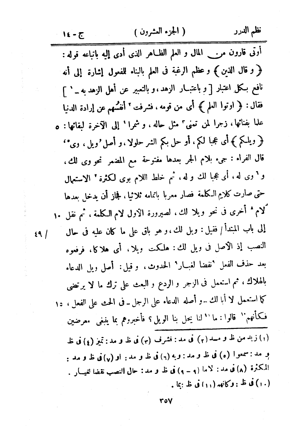 أوتي قارون من المال والعلم الظاهر الذي أدى إليه باتباعه قوله: {وقال الذين} وعظم الرغبة في العلم بالبناء للمفعول إشارة إلى أنه نافع بكل اعتبار وباعتبار الزهد، وبالتعبير عن أهل الزهد به فقال: {أوتوا العلم} أي من قومه، فشرفت أنفسُهم عن إرادة الدنيا علماً بفنائها، زجراً لمن تمنى مثل حاله، وشمراً إلى الآخرة لبقائها: {ويلكم} أي عجباً لكم، أو حل بكم الشر حلولاً، وأصل ويل، «وي» قال الفراء: جيء بلام الجر بعدها مفتوحة ما المضمر نحو وي لك، ووي له، أي عجباً لك وله، ثم خلط اللام بوي لكثرة الاستعمال حتى صارت كلام الكلمة فصار معرباً بإتمامه ثلاثياً، فجاز أن يدخل بعدها لام أخرى في نحو ويلاً لك، لصيرورة الأول لام الكلمة، ثم نقل إلى باب المبتدأ فقيل: ويل لك، وهو باق على ما كان عليه في حال النصب إذ الأصل في ويل لك: هلكت ويلاً، أي هلاكاً فرفعوه بعد حذف الفعل نفضاً لغبار الحدوث، وقيل: أصل ويل الدعاء بالهلاك، ثم استعمل في الزجر والردع والبعث على ترك ما لا يرتضى كما استعمل لا أبا لك - وأصله الدعاء على الرجل - في الحث على الفعل، فكأنهم قالوا: ما لنا يحل بنا الويل؟ فأخبروهم بما ينبغي معرضين