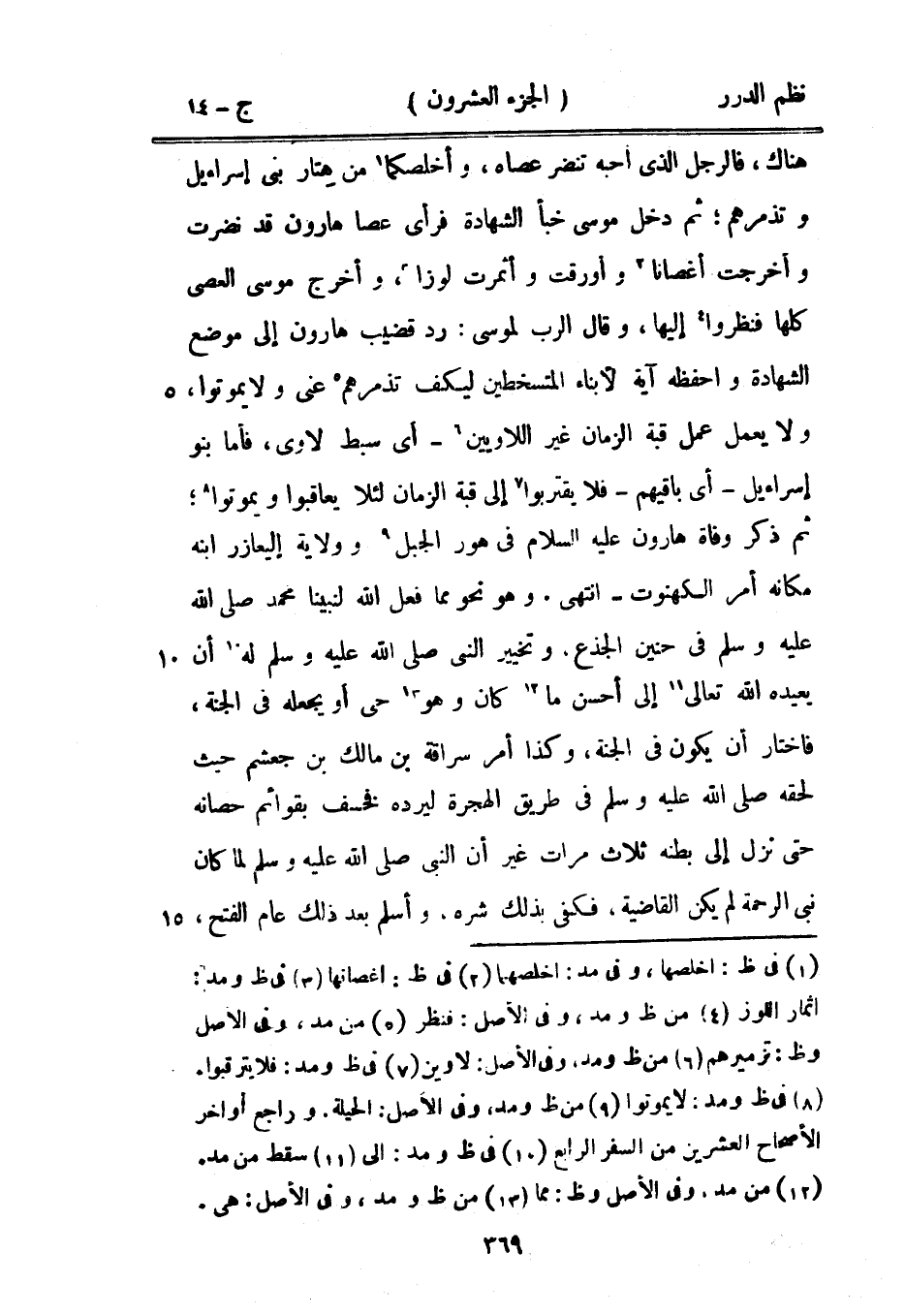 هناك، فالرجل الذي أحبه تنضر عصاه، وأخلصكما من هتار بني إسرائيل وتذمرهم؛ ثم دخل موسى خبأ الشهادة فرأى عصا هارون قد نضرت وأخرجت أغصاناً وأورقت وأثمرت لوزاً، وأخرج موسى العصي كلها فنظروا إليها، وقال الرب لموسى: رد قضيب هارون إلى موضع الشهادة واحفظه آية لأبناء المتسخطين ليكف تذمرهم عني ولا يموتوا، ولا يعمل عمل قبة الزمان غير اللاويين - أي سبط لاوي، فأما بنو إسرائيل - أي باقيهم - فلا يقتربوا إلى قبة الزمان لئلا يعاقبوا ويموتوا؛ ثم ذكر وفاة هارون عليه السلام في هور الجبل وولاية إليعازر ابنه مكانه أمر الكهنوت - انتهى. وهو نحو مما فعل الله لنبينا محمد صَلَّى اللهُ عَلَيْهِ وَسَلَّمَ في حنين الجذع، وتخيير النبي صَلَّى اللهُ عَلَيْهِ وَسَلَّمَ له أن يعيده تعالى إلى أحسن ما كان وهو حي أو يجعله في الجنة، فاختار أن يكون في الجنة، وكذا أمر سراقة بن مالك بن جعشم حيث لحقه صَلَّى اللهُ عَلَيْهِ وَسَلَّمَ في طريق الهجرة ليرده فخسف بقوائم حصانه حتى نزل إلى بطنه ثلاث مرات غير أن النبي صَلَّى اللهُ عَلَيْهِ وَسَلَّمَ لما كان نبي الرحمة لم يكن القاضية، فكفى بذلك شره، وأسلم بعد ذلك علم الفتح،