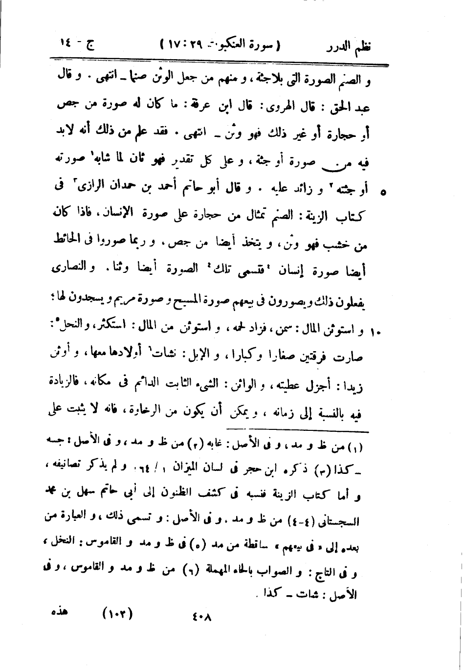 وقال عبد الحق: قال الهروي: قال ابن عرفة: ما كان له صورة من جص أو حجارة أو غير ذلك فهو وثن - انتهى. فقد علم من ذلك أنه لا بد فيه من صورة أو جثة، وعلى كل تقدير فهو ثان لما شابه صورته أو جثته وزائد عليه. وقال أبو حاتم أحمد بن حمدان الرازي في كتاب الزينة: الصنم تمثال من حجارة على صورة الإنسان، فإذا كان من خشب فهو وثن، ويتخذ أيضاً من جص، وربما صوروا في الحائط أيضاً صورة إنسان فتسمى تلك الصورة أيضاً وثناً، والنصارى يفعلون ذلك ويصورون في بيعهم صورة المسيح وصورة مريم ويسجدون لها: واستوثن المال: سمن، فزاد لحمه، واستوثن من المال: استكثر، والنحل: صارت فرقتين صغاراً وكباراً، والإبل: نشأت أولادها معها، وأوثن زيداً: أجزل عطيته، والواثن: الشيء الثابت الدائم في مكانه، فالزيادة فيه بالنسبة إلى زمانه، ويمكن أن يكون من الرخاوة، فإنه لا يثبت على