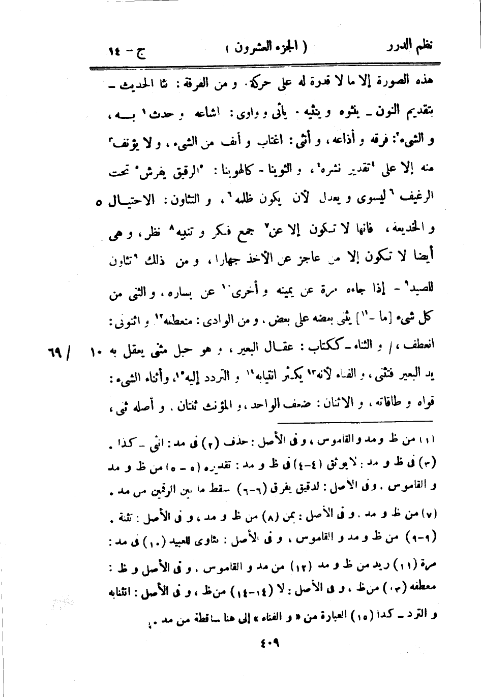 هذه الصورة إلا ما لا قدرة له على حركة. ومن الفرقة: نثا الحديث - بتقديم النون - ينثوه وينثيه. يائي وواوي: أشاعه وحدث به، والشيء: فرقه وأذاعه، وأنثى: اغتاب وأنف من الشيء، ولا يؤنف منه إلا على تقدير نشره، والثوينا كالهوينا: الرقيق يفرش تحت الرغيف ليسوى ويعدل لأن يكون ظلمه، والتثاون: الاحتيال والخديعة، فإنها لا تكون إلا عن جمع فكر وتنبيه نظر، وهي أيضاً لا تكون إلا من عاجز عن الأخذ جهاراً، ومن ذلك تثاون للصيد - إذا جاءه مرة عن يمينه وأخرى عن يساره، والثني من كل شيء ما يثنى بعضه على بعض، ومن الوادي: منعطفه، واثنونى: انعطف، والثناء ككتاب: عقال البعير، وهو حبل مثنى يعقل به يد البعير فتثنى، والفناء لأنه يكثر انتيابه والتردد إليه، وأثناء الشيء: قواه وطاقاته، والاثنان: ضعف الواحد، والمؤنث ثنتان، وأصله ثنى،