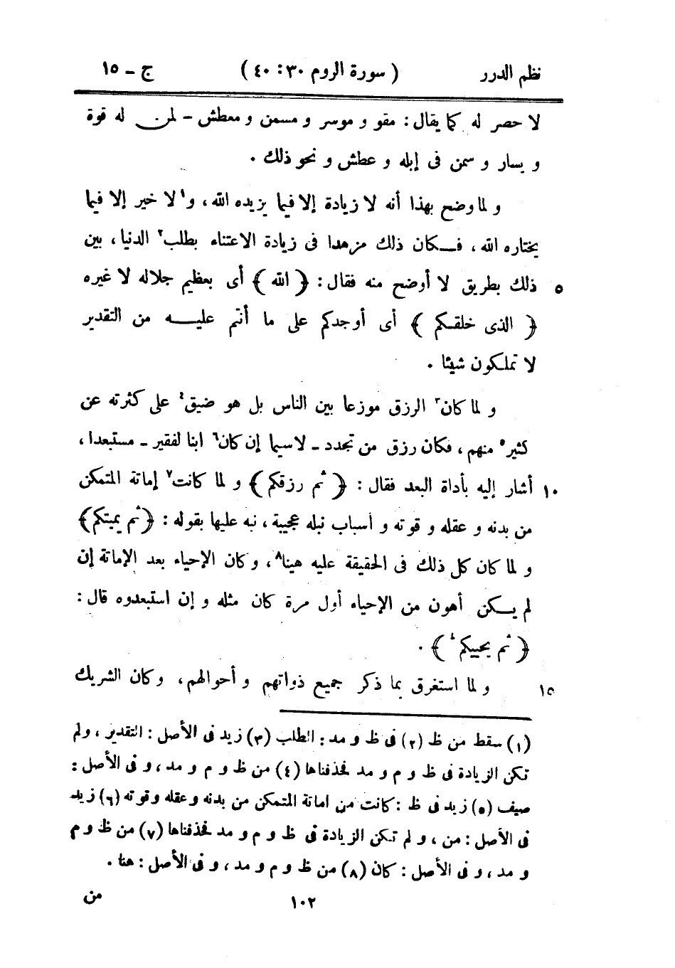 ولما كان الرزق موزعاً بين الناس بل هو ضيق على كثرته عن كثير منهم، فكان رزق من تجدد - لا سيما إن كان ابناً لفقير - مستبعداً، أشار إليه بأداة البعد فقال: {ثم رزقكم} ولما كانت إماتة المتمكن من بدنه وعقله وقوته وأسباب نبله عجيبة، نبه عليها بقوله: {ثم يميتكم} ولما كان كل ذلك في الحقيقة عليه هيناً، وكان الإحياء بعد الإماتة إن لم يكن أهون من الإحياء أول مرة كان مثله وإن استبعدوه قال: {ثم يحييكم} .