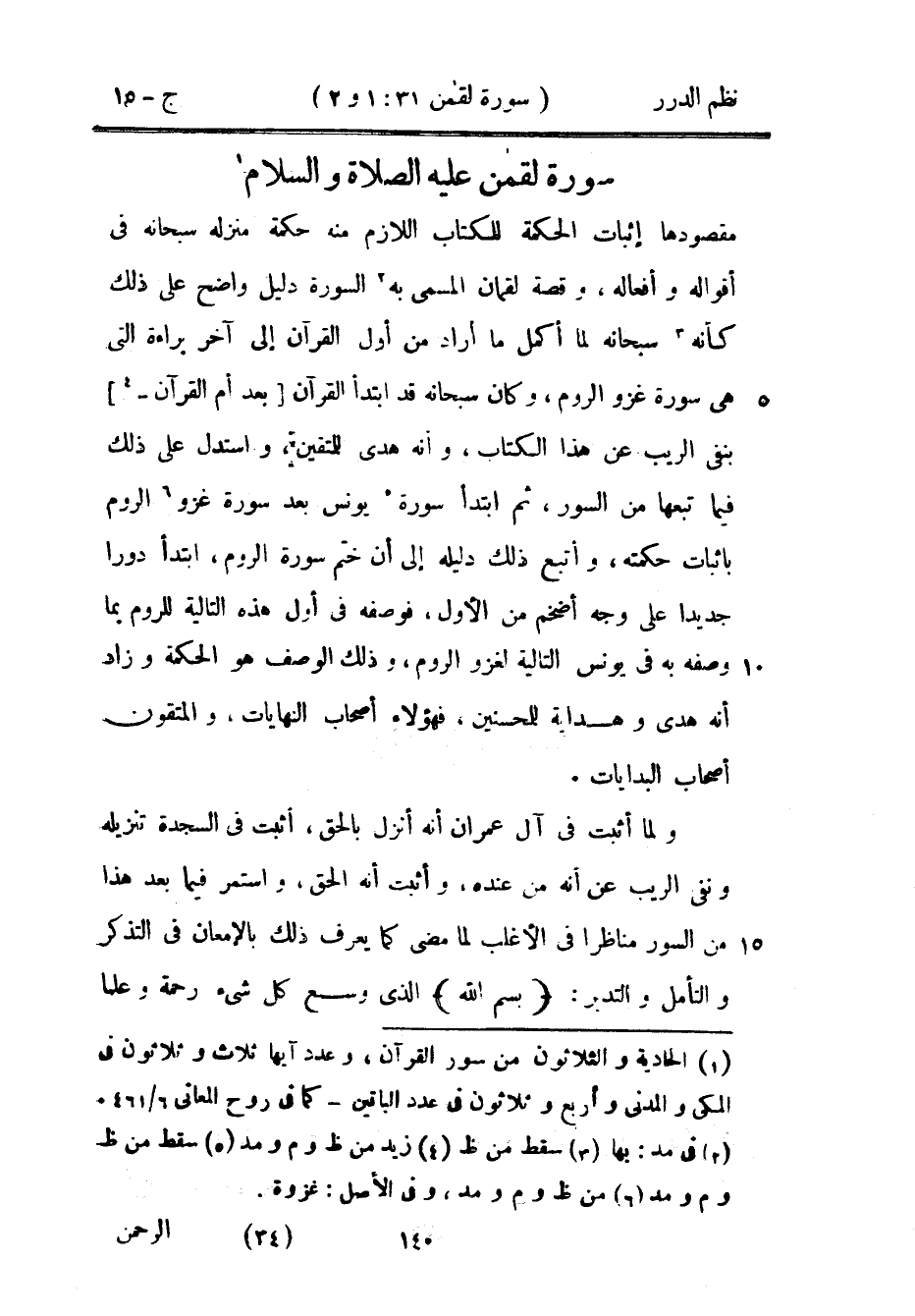 مقصودها إثبات الحكمة للكتاب اللازم منه حكمة منولة سبحانه في أقواله وأفعاله، وقصة لقمان المسمى به السورة دليل واضح على ذلك كأنه سبحانه لما أكمل ما أ) اد من أول القرآن إلى آخره براءة الني هي سورة عزو الروم، وكان سبحانه قد ابتدأ القرآن أم القرآن بنفي الريب عن هذا الكتاب، وأنه هدى للمتقين، واستدل على ذلك فيما تبعها من السور، ثن ابتدأ سورة يونس بعد سورة عزو الروم بإثبات حكمته، وأتبع ذلك دليله إلى أن ختم سورة الروم، ابتدأ دورا جديدا على وجه أضخم من الأول، فوصفه في أول هذه التالية للروم بما وصفه به في يونس التالية لغزو الروم، وذلك الوصف هو الحكمة وزاد أنه هدى وهداية للمحسنين، فهؤلاء أصحاب النهايات، والمتقون أصحاب البدايات.
