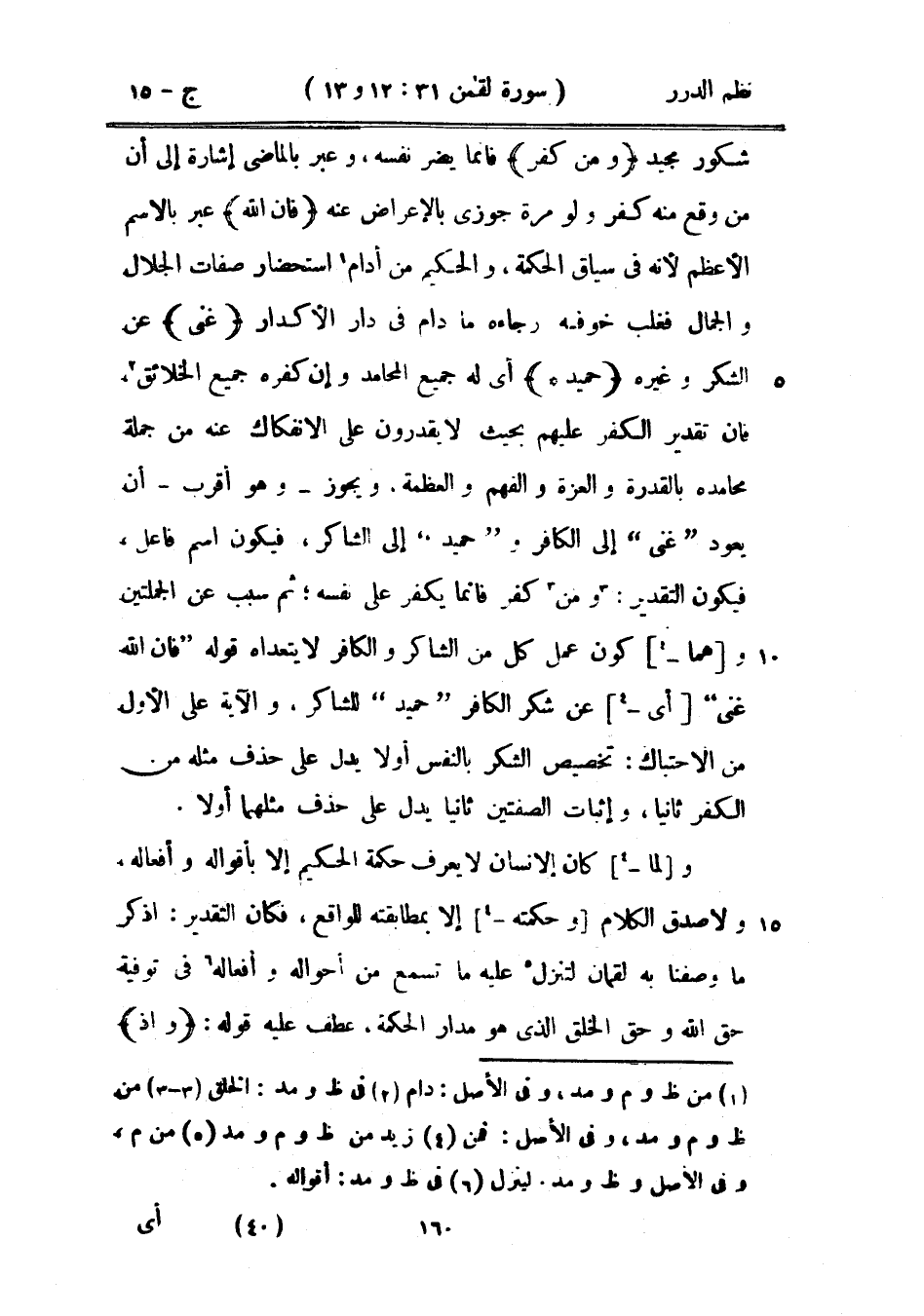 شكور مجيد {ومن كفر} فإنما يضر نفسه، وعبر بالماضي إشارة إلى أن من وقع منه كفر ولو مرة جوزي بالإعراض عنه {فإن الله} عبر بالاسم الأعظم لأنه في سياق الحكمة، والحكيم من أدام استحضار صفات الجلال والجمال فغلب خوفه رجاءه ما دام في دار الأكدار {غني} عن الشكر وغيره {حميد *} أي له جميع المحامد وإن كفره جميع الخلائق، فإن تقدير الكفر عليهم بحيث لا يقدرون على الانفكاك عنه من جملة محامدة بالقدرة والعزة والفهم والعظمة. ويجوز - وهو أقرب - أن يعود «غني» إلى الكافر و «حميد» إلى الشاكر، فيكون اسم فاعل، فيكون التقدير: ومن كفر فإنما يكفر على نفسه، ثم سبب عن الجملتين وهما كون عمل كل من الشاكر والكافر لا يتعداه قوله «فإن الله غني» أي عن شكر الكافر «حميد» للشاكر، والآية على الأول من الاحتباك: تخصيص الشكر بالنفس أولاً يدل على حذف مثله من الكفر ثانيا، وإثبات الصفتين يدل على حذف مثلهما أولاً.