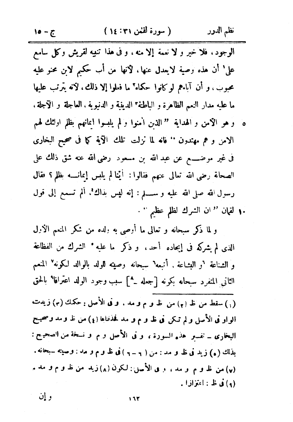 الوجود، فلا خير ولا نعمة إلا منه، وفي هذا تنبيه لقريش وكل سامع على أن هذه وصية لا يعدل عنها، لأنها من أب حكيم لابن محنو عليه محبوب، وأن آباءهم لو كانوا حكماء ما فعلوا إلا ذلك، لأنه يترتب عليها ما عليه مدار النعم الظاهرة والباطنة الدينية والدنيوية، العاجلة والآجلة، وهو الأمن والهداية {الذين آمنوا ولم يلبسوا إيمانهم بظلم أولئك لهم الأمن وهم مهتدون} [الأنعام: 82] فإنه لما نزلت تلك الآية كما هو صحيح البخاري في غير موضع عن عبد الله بن مسعود رضي الله عنه شق ذلك على الصحابة رضي الله تعالى عنهم فقالوا: أيّنا لم يلبس إيمانه بظلم؟ فقال رسول الله صَلَّى اللهُ عَلَيْهِ وَسَلَّمَ: «إنه ليس بذاك، ألم تسمع إلى قول لقمان {إن الشر لظلم عظيم} » .
