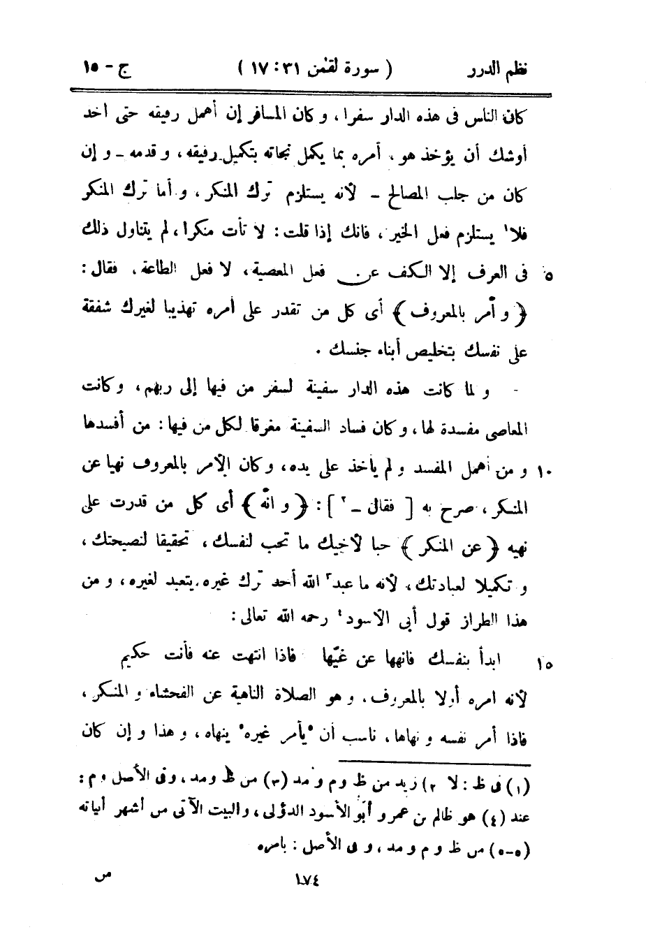 ولما كانت هذه الدار سفينة لسفر من فيها إلى ربهم، وكانت المعاصي مفسدة لها، وكان فساد السفينة مغرقاً لكل من فيها: من أفسدها ومن أهمل المفسد ولم يأخذ على يده، وكان الأمر بالمعروف نهياً عن المنكر، صرح به فقال: {وانه} أي كل من قدرت على نهيه {عن المنكر} حباً لأخيك ما تحب لنفسك، تحقيقاً لنصيحتك، وتكميلاً لعبادتك، لأنه ما عبد الله أحد ترك غيره يتعبد لغيره، ومن هذا الطراز قول أبي الأسود رحمه الله تعالى: