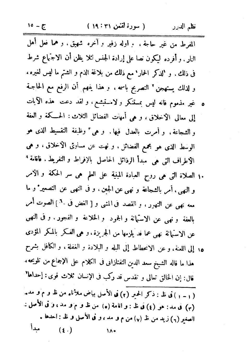 المفرط من غير حاجة، وأوله زفير وآخره شهيق، وهما فعل أهل النار، وأفرده ليكون نصاً على إرادة الجنس لئلا يظن أن الاجتماع شرط في ذلك ولذكر الحمار مع ذلك من بلاغة الذم والشتم ما ليس لغيره ولذلك يستهجن التصريح باسمه، وهذا يفهم أن الرفع مع الحاجة غير مذموم فإنه ليس بمستنكر ولا مستبشع، ولقد دعت هذه الآيات إلى معالي الأخلاق، وهي أمهات الفضائل الثلاث: الحكمة والعفة والشجاعة، وأمرت بالعدل فيها، وهي وظيفة التقسيط الذي هو الوسط الذي هو مجمع الفضائل، ونهت عن مساؤى الأخلاق، وهي الأطراف التي هي مبدأ الرذائل الحاصل بالإفراط والتفريط، فإقامة الصلاة التي هي روح العبادة المبنية على العلم هي سر الحكمة والنهي، أمر بالشجاعة ونهى عن الجبن، وفي النهي عن التصعير وما معه نهي عن التهور، والقصد في المشي والغض في الصوت أمر بالعفة ونهي عن الاستماتة والجمود والخلاعة والفجور، وفي النهي عن الاستماتة نهي عما قد يلزمها من الجربزة، وهي الفكر بالمكر المؤدي إلى اللعنة، وعن الانحطاط إلى البله والغفلة، والكافل بشرح هذا ما قاله الشيخ سعد الدين التفتازاني في الكلام على الإجماع من تلويحه، قال: إن الخالق تعالى وتقدس قد ركب في الإنسان ثلاث قوى: إحداها