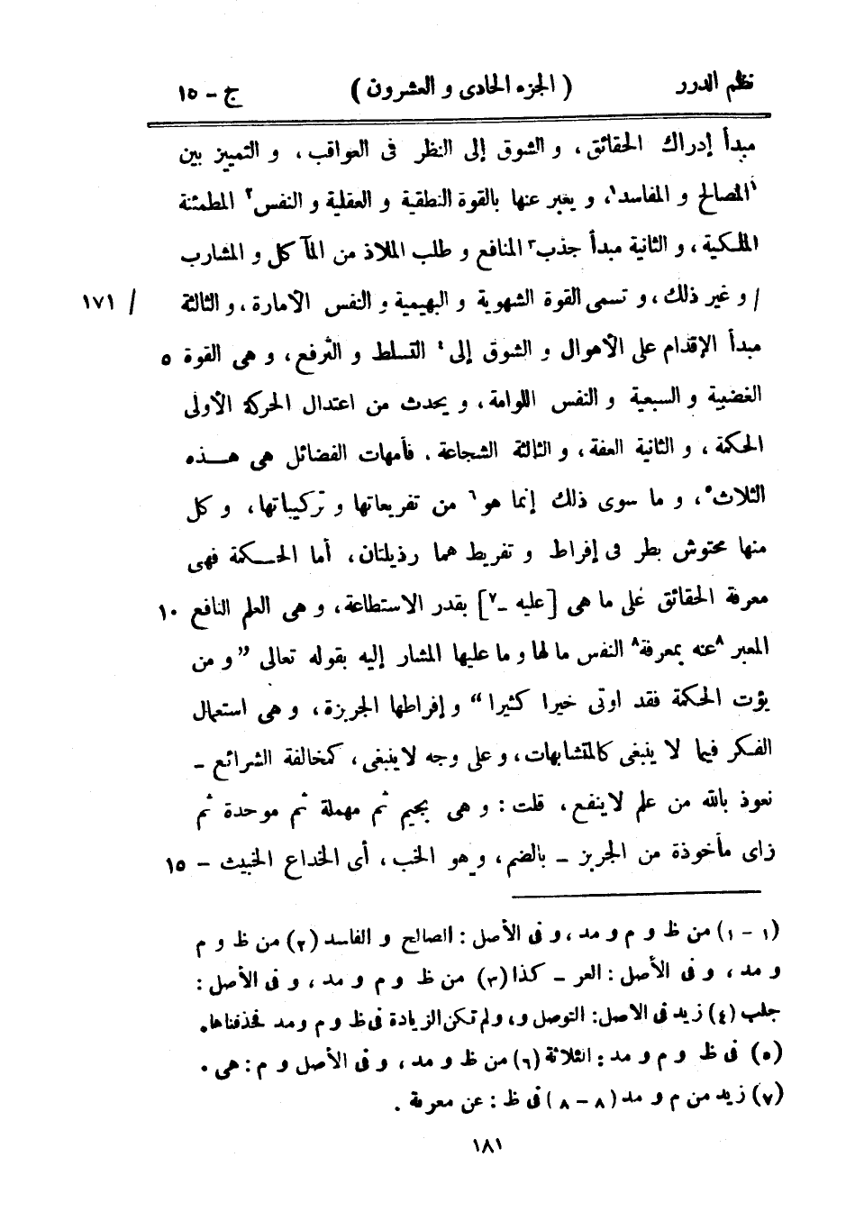مبدأ إدراك الحقائق، والشوق إلى النظر في العواقب، والتمييز بين المصالح والمفاسد، ويعبر عنها بالقوة النطقية والعقلية والنفس المطمئنة الملكية، والثانية مبدأ جذب المنافع وطلب الملاذ من المآكل والمشارب وغير ذلك، وتسمى القوة الشهوية والبهيمية والنفس الأمارة، والثالثة مبدأ الإقدام على الأهوال والشوق إلى التسلط والترفع، وهي القوة الغضبية والسبعية والنفس اللوامة، ويحدث من اعتدال الحركة الأولى الحكمة، والثانية العفة، والثالثة الشجاعة، فأمهات الفضائل هي هذه الثلاث، وما سوى ذلك إنما هو من تفريعاتها وتركيباتها، وكل منها وكل منها محتوش بطر في إفراط وتفريط هما رذيلتان، أما الحكمة فهي معرفة الحقائق على ما هي بقدر الاستطاعة، وهي العلم النافع المعبر عنه بمعرفة النفس ما لها وما عليها المشار إليه بقوله تعالى: