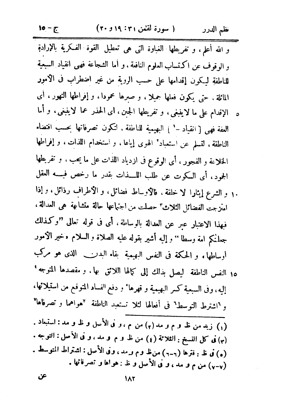 والله أعلم، وتفريطها الغباوة التي هي تعطيل القوة الفكرية بالإرداة والوقوف عن اكتساب العلوم النافعة، وأما الشجاعة فهي انقياد السبعية للناطقة ليكون إقدامها على حسب الروية من غير اضطراب في الأمور الماثلة، حتى يكون فعلها جميلاً، وصبرها محموداً، وإفراطها التهور، أي الإقدام على ما لا ينبغي، وتفريطها الجبن، أي الحذر عما لا ينبغي، وأما العفة فهي انقياد البهيمة للناطقة، لتكون تصرفاتها بحسب اقتضاء الناطقة، لتسلم عن استعباد الهوى إياها، واستخدام اللذات، وإفراطها الخلاعة والفجور، أي الوقوع في ازدياد اللذات على ما يجب، وتفريطها الجمود، أي السكوت عن طلب الذات بقدر ما رخص فيه العقل والشرع إيثاراً لا خلقة، فالأوساط فضائل، والأطراف رذائل، وإذا امتزجت الفضائل الثلاث حصلت من اجتماعها حالة متشابهة هي العدالة، فبهذا الاعتبار عبر عن العدالة بالوساطة، أي في قوله تعالى: {وكذلك جعلناكم أمة وسطاً} [البقرة: 143] وإليه أشير بقوله عليه الصلاة والسلام «خير الأمور أوساطها» والحكمة في النفس البهيمية بقاء البدن الذي هو مركب النفس الناطقة ليصل إلى كمالها اللائق بها، ومقصدها المتوجه إليه، وفي السبعية كسر البهيمية وقهرها ودفع الفساد المتوقع من استيلائها، واشترط التوسط في أفعالها لئلا تستعبد الناطقة هواهما وتصرفاها