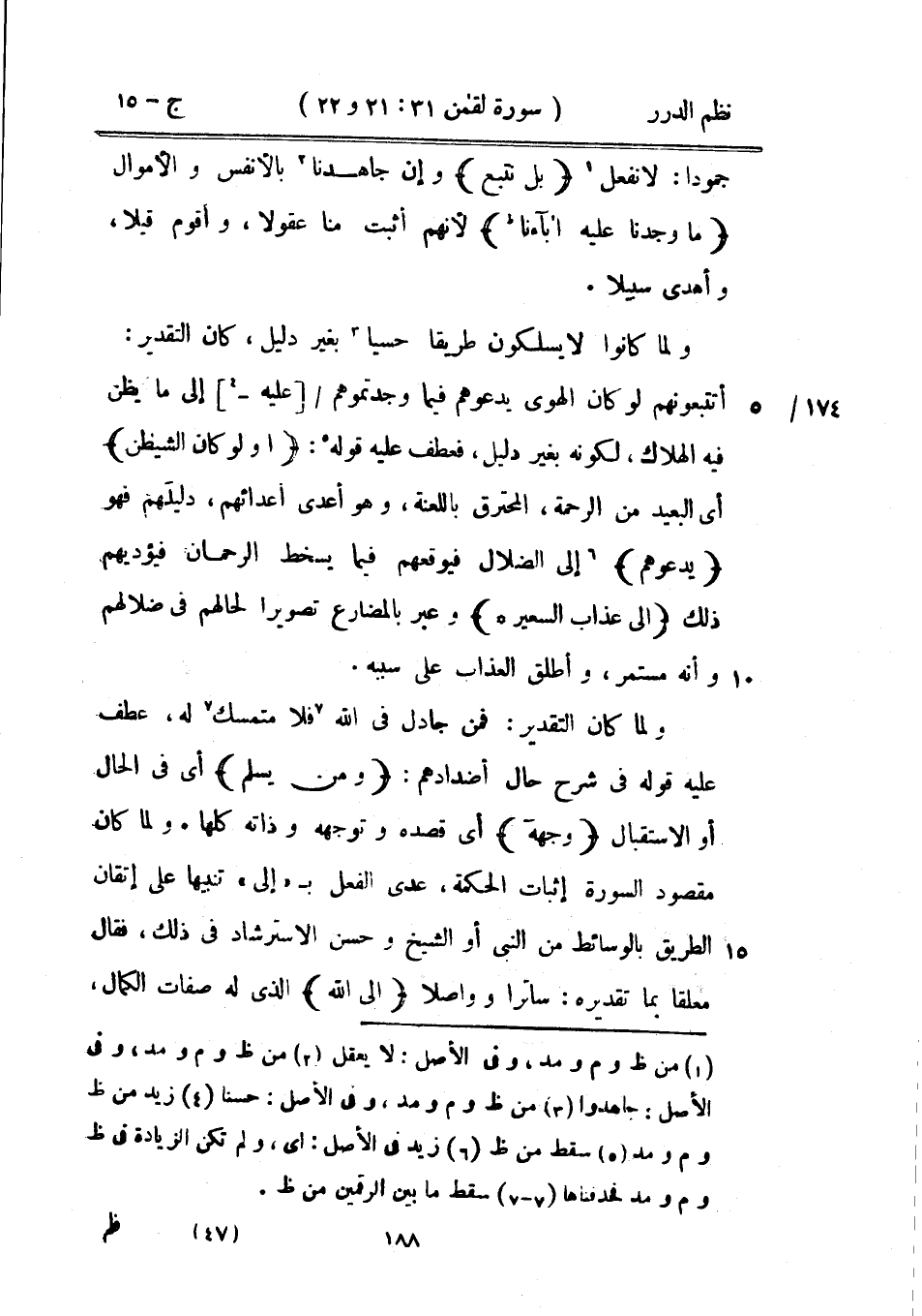 ولما كان التقدير: فمن جادل في الله فلا متمسك له، عطف عليه قوله في شرح حال أضدادهم: {ومن يسلم} أي في الحال أو الاستقبال {وجهه} أي قصده وتوجهه وذاته كلها. ولما كان مقصود السورة إثبات الحكمة، عدى الفعل ب «إلى» تنبيهاً على إتقان الطريق بالوسائط من النبي أو الشيخ وحسن الاسترشاد في ذلك، فقال معلقاً بما تقديره: ساتراً وواصلاً {إلى الله} الذي له صفات الكمال،