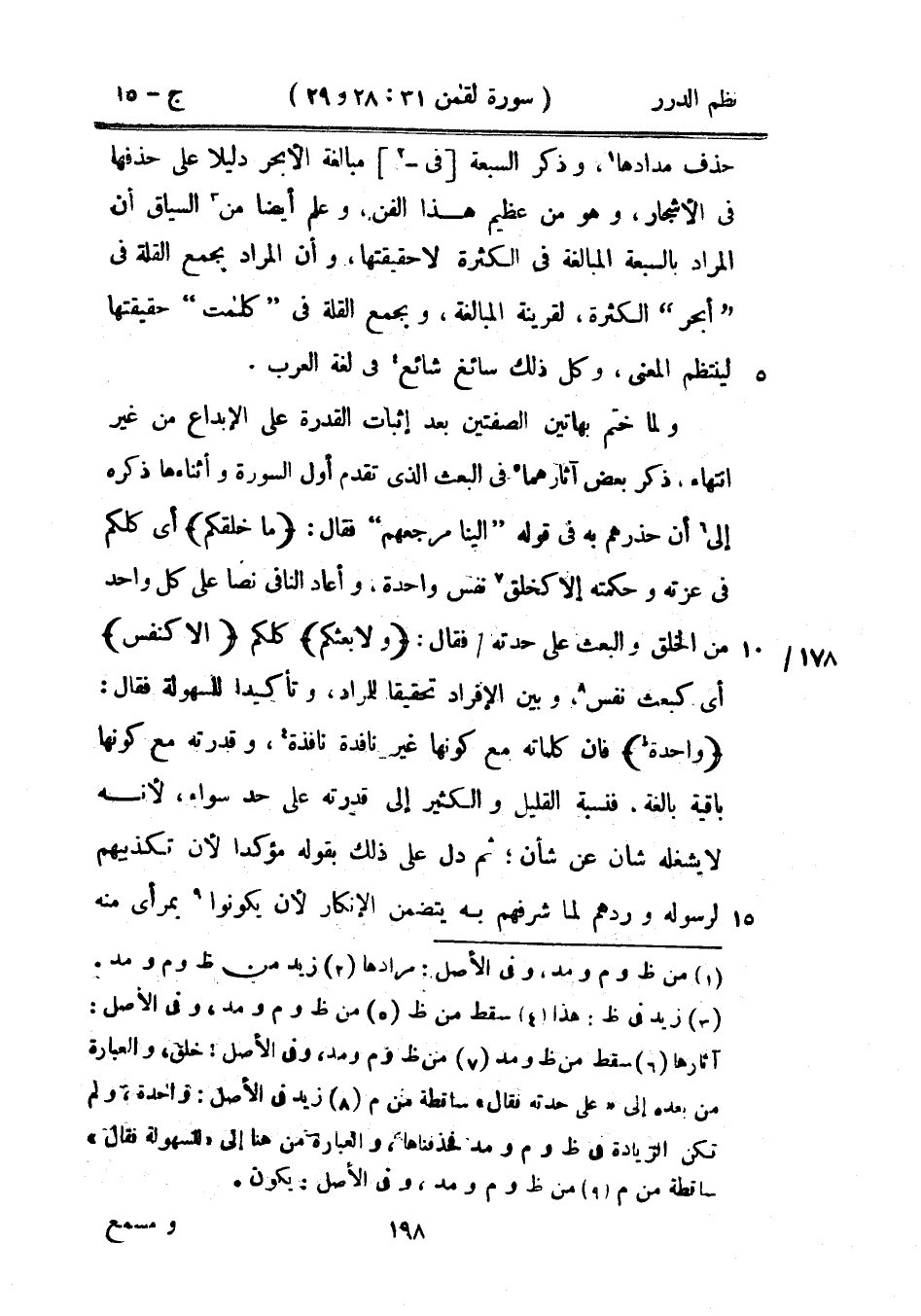 حذف مدادها، وذكر السبعة في مبالغة الأبحر دليلاً على حذفها في الأشجار، وهو من عظيم هذا الفن، وعلم أيضاً من السياق أن المراد بالسبعة المبالغة في الكثرة لا حقيقتها، وأن المراد بجمع القلة في «أبحر» الكثرة، لقرينة المبالغة، وبجمع القلة في {كلمات} حقيقتها لينتظم المعنى، وكل ذلك سائغ شائع في لغة العرب.