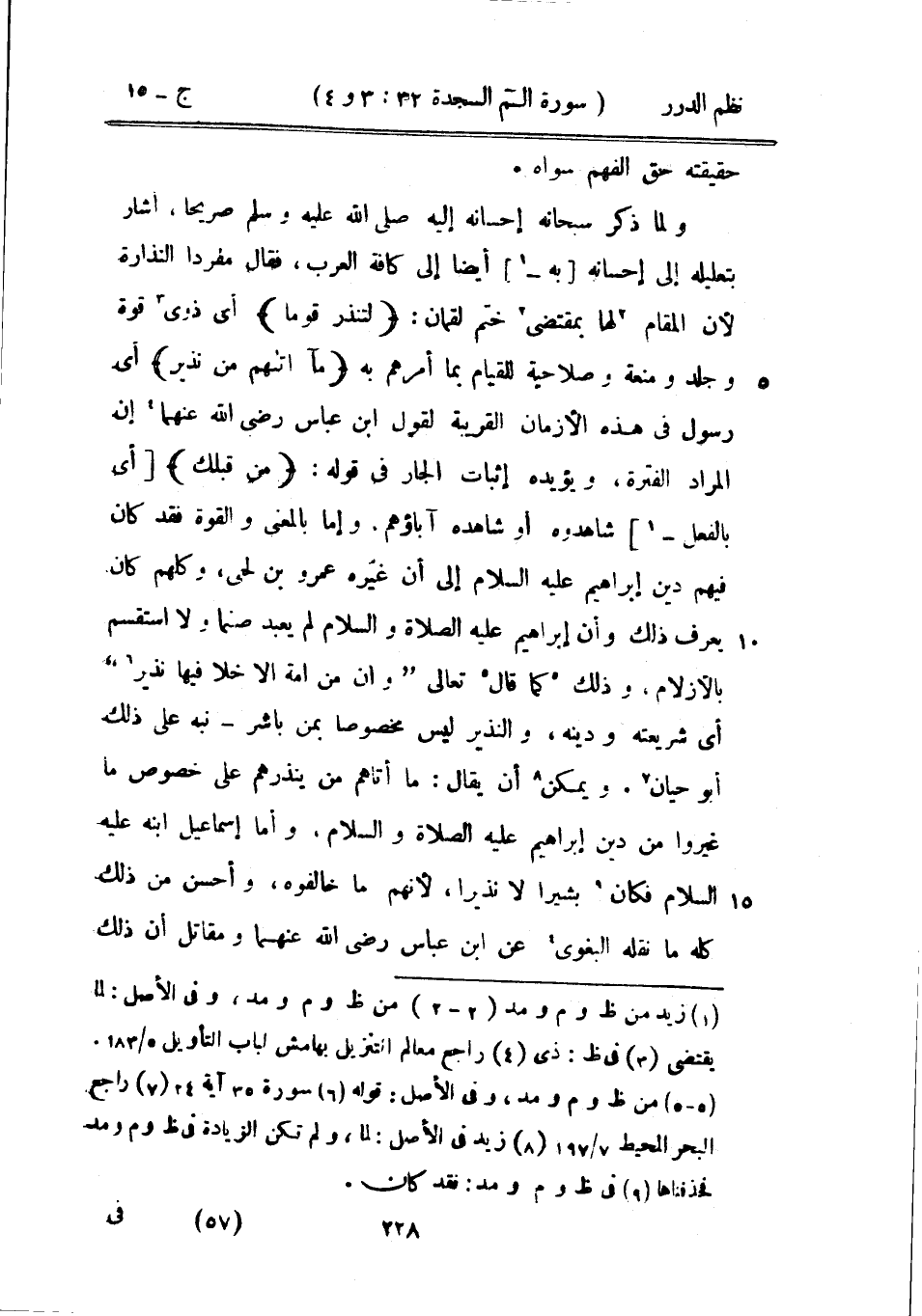 ولما ذكر سبحانه إحسانه إليه صَلَّى اللهُ عَلَيْهِ وَسَلَّمَ صريحاً، أشار بتعليله إلى إحسانه به أيضاً إلى كافة العرب، فقال مفرداً النذارة لأن المقام له بمقتضى ختم لقمان: {لتنذر قوماً} أي ذوي قوة جلد ومنعة وصلاحية للقيام بما أمرهم به {ما أتاهم من نذير} أي رسول في هذه الإزمان القريبة لقول ابن عباس رضي الله عنهما أن المراد الفترة، ويؤيده إثبات الجار في قوله: {من قبلك} أي بالفعل شاهدوه أو شاهده آباؤهم. وإما بالمعنى والقوة فقد كان فيهم دين إبراهيم عليه السلام إلى أن غيّره عمرو بن لحي، وكلهم كان يعرف ذلك وأن إبراهيم عليه الصلاة والسلام لم يعبد صنماً ولا استقسم بالأزلام، وذلك كما قال تعالى: