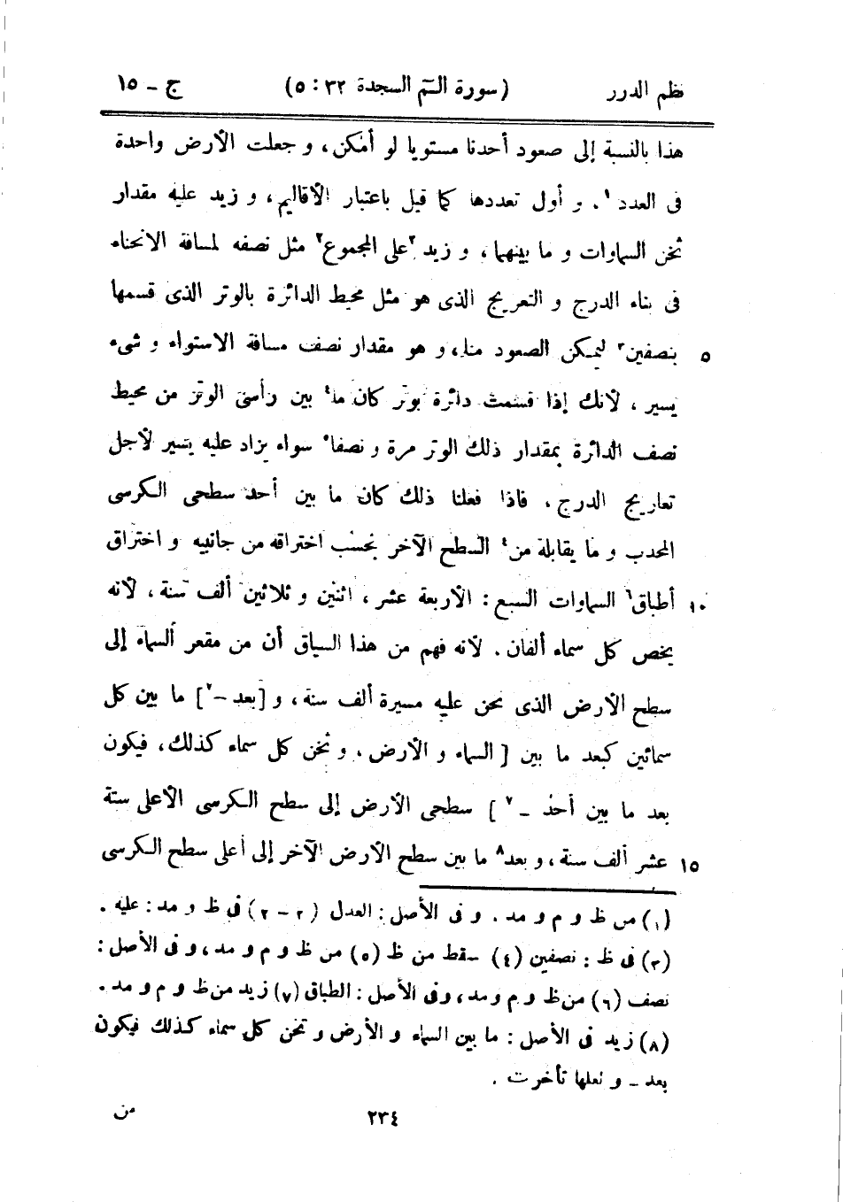 هذا بالنسبة إلى صعود أحدنا مستوياً لو أمكن، وجعلت الأرض واحدة في العدد، وأول تعددها كما قيل باعتبار الأقاليم، وزيد عليه مقدار ثخن السماوات وما بينهما، وزيد على المجموع مثل نصفه لمسافة الانحناء في بناء الدرج والتعريج الذي هو مثل محيط الدائرة بالوتر الذي قسمها بنصفين ليمكن الصعود منا، وهو مقدار نصف مسافة الاستواء وشيء يسير، لأنك إذا قسمت دائرة بوتر كان ما بين رأسي الوتر من محيط نصف الدائرة بمقدار ذلك الوتر مرة ونصفاً سواء يزاد عليه يسير لأجل تعاريج الدرج، فإذا فعلنا ذلك كان ما بين أحد سطحي الكرسي المحدب وما يقابله من السطح الآخر بحسب اختراقه من جانبيه واختراق أطباق السماوات السبع: الأربعة عشر، اثنين وثلاثين ألف سنة، لأنه يخص كل سماء ألفان، لأنه فهم من هذا السياق أن من مقعر السماء إلى سطح الأرض الذي نحن عليه سيرة ألف سنة وبعد ما بين كل سمائين كبعد ما بين السماء والأرض، وثخن كل سماء كذلك، فيكون بعد ما بين أحد سطحي الأرض إلى سطح الكرسي الأعلى ستة عشر ألف سنة، وبعد ما بين سطح الأرض إلى أعلى سطح الكرسي
