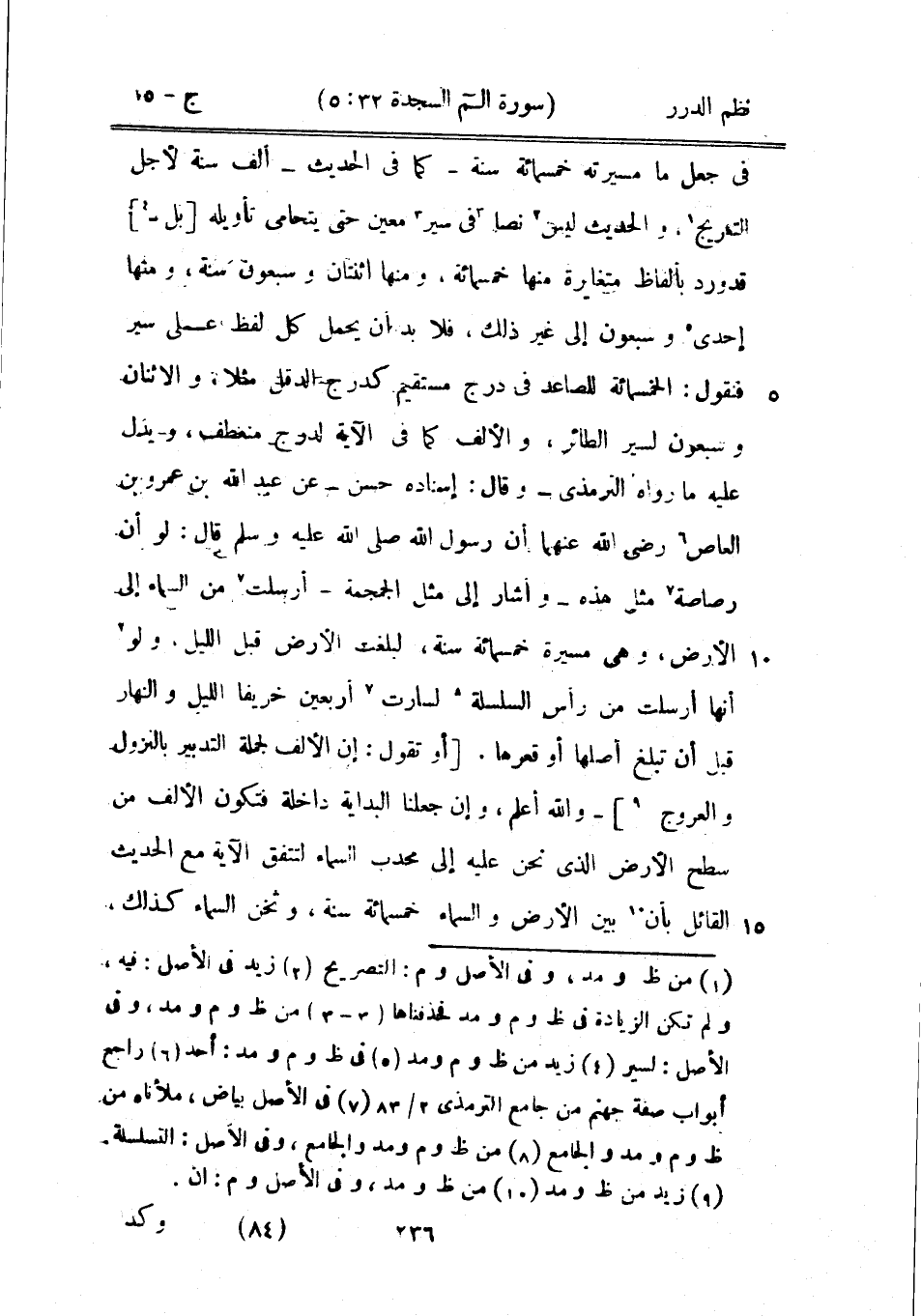 «لو أن رصاصة مثل هذه - وأشار إلى مثل الجمجمة - أرسلت من السماء إلى الأرض، وهي مسيرة خمسمائة سنة، لبلغت الأرض قبل الليل، ولو أنها أرسلت السلسلة لسارت أربعين خريفاً الليل والنهار قبل أن تبلغ أصلها أو قعرها» ، أو تقول: إن الألف لجملة التدبير بالنزول والعروج - والله أعلم، وإن جعلنا البداية داخلة فتكون الألف من سطح الأرض الذي نحن عليه إلى محدب السماء لتتفق الآية مع الحديث القائل بأن بين الأرض والمساء خمسمائة سنة، وثخن السماء كذلك،