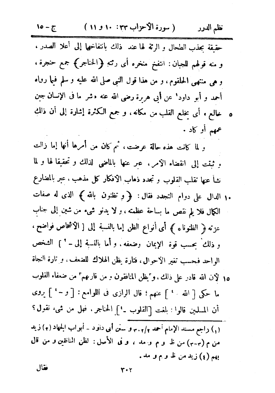 حقيقة بجذب الطحال والرئة لها عند ذلك بانتفاخهما إلى أعلى الصدر، ومنه قولهم للجبان: انتفخ منخره أي رئته {الحناجر} جمع حنجرة، وهي منتهى الحلقوم، ومن هذا قول النبي صَلَّى اللهُ عَلَيْهِ وَسَلَّمَ فيما رواه أحمد وأبو داود عن أبي هريرة رضي الله عنه «شر ما في الإنسان جبن خالع» أي يخلع القلب من مكانه، وجمع الكثرة إشارة إلى أن ذلك عمهم أو كاد.