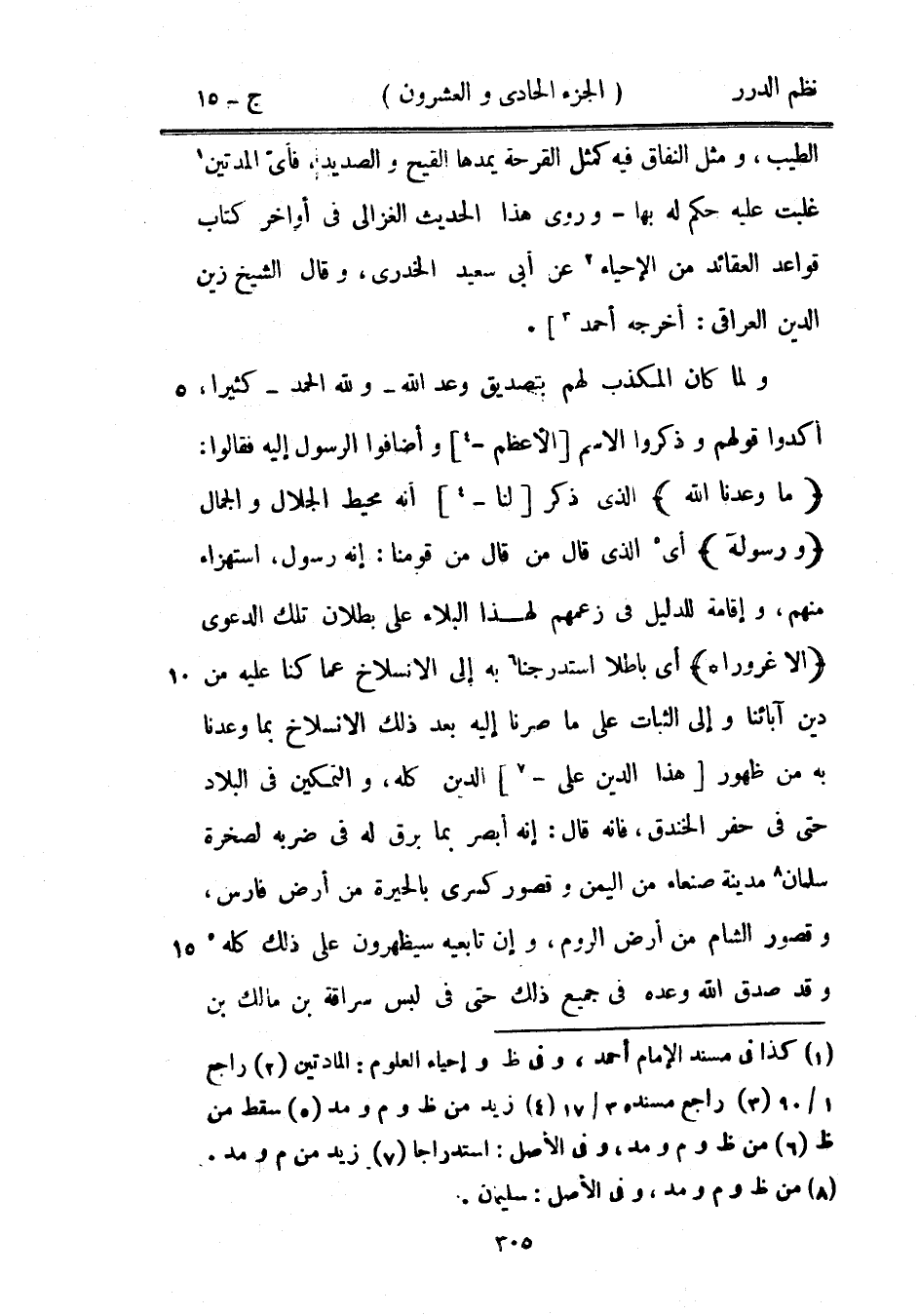 الطيب، ومثل النفاق فيه كمثل القرحة يمدها القيح والصديد، فأيّ المدتين غلبت عليه حكم له بها» وروى هذا الحديث الغزالي في أواخر كتاب قواعد العقائد من الإحياء عن أبي سعيد الخدري، وق الشيخ زين الدين العراقي: أخرجه أحمد.