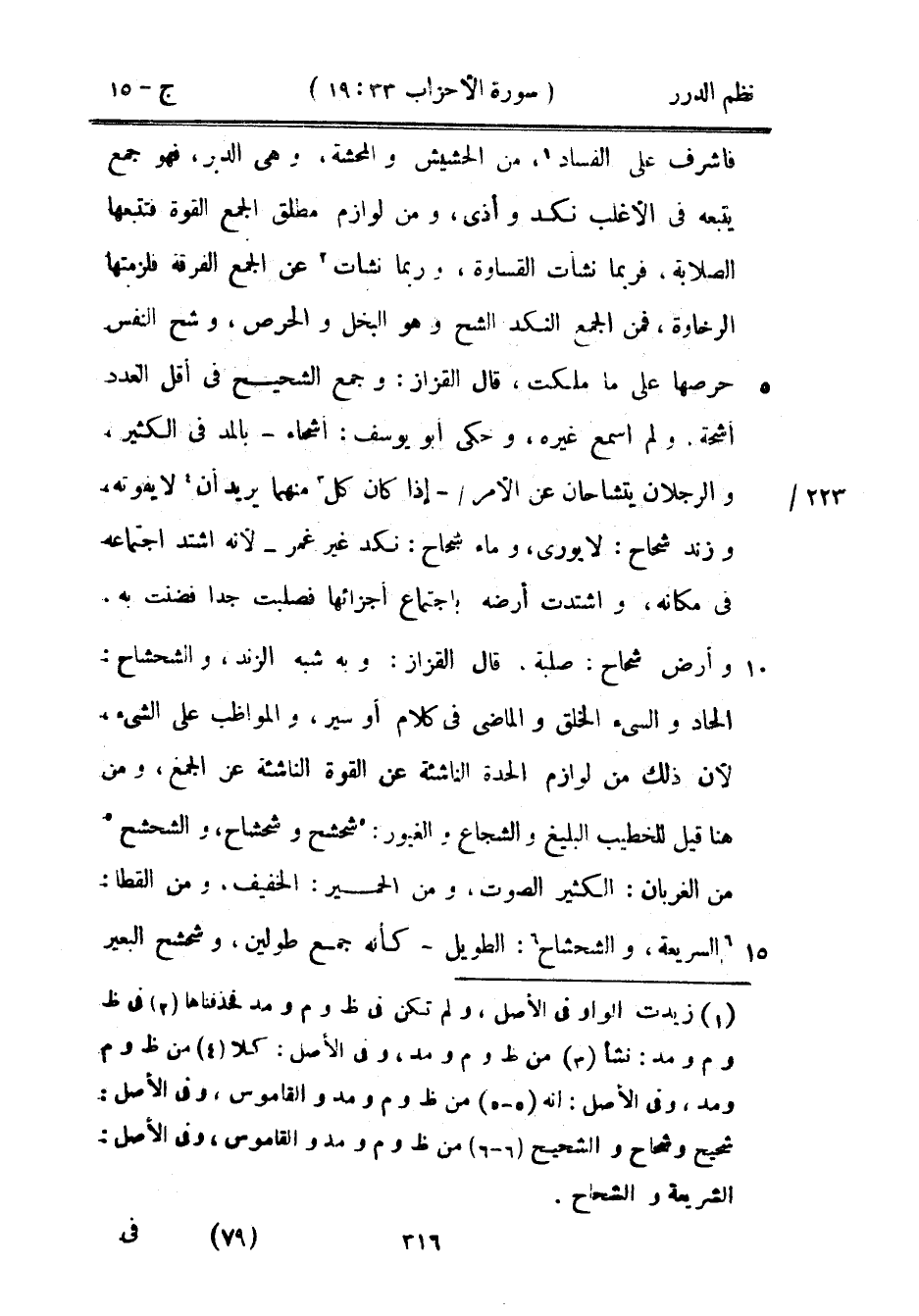 فأشرف على الفساد، من الحشيش والمحشة، وهي الدبر، فهو جمع يتبعه في الأغلب نكد وأذى، ومن لوازم مطلق الجمع القوة فتتبعها الصلابة، فربما نشأت القساوة، وربما نشأت عن الجمع الفرقة فلزمها الرخاوة، فمن الجمع النكد الشح وهو البخل والحرص، وشح النفس حرصها على ما ملكت، قال القزاز: وجمع الشحيح في أقل العدد أشحة، ولم أسمع غيره، وحكى أبو يوسف: أشحاء - بالمد في الكثير، والرجلان يتشاحان عن الأمر - إذا كان كل منهما يريد أن لا يفوته، وزند شحاح: لا يورى، وماء شحاح: نكد غير غمر - لأنه اشتد اجتماعه في مكانه، واشتدت أرضه باجتماع أجزائها فصلبت جداً فضنت به.
