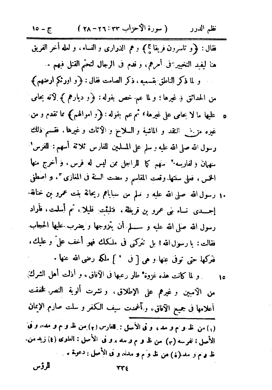 ولما ذكر الناطق بقسميه، ذكر الصامت فقال: {وأورثكم أرضهم} من الحدائق وغيرها؛ ولما هم خص بقوله: {وديارهم} لأنه يحامي عليها ما لا يحامي على غيرها؛ ثم عم بقوله: {وأموالهم} مما تقدم ومن غيره من النقد والماشية والسلاح والأثاث وغيرها، فقسم ذلك رسول الله صَلَّى اللهُ عَلَيْهِ وَسَلَّمَ للفارس ثلاثة أسهم: للفرس سهمان ولفارسه سهم كما للراجل ممن ليس له فرس وأخرج منها الخمس فعلى سنتها وقعت المقاسم ومضت السنة في المغازي، واصطفى رسول الله صَلَّى اللهُ عَلَيْهِ وَسَلَّمَ من سباياهم ريحانة بنت عمرو بن خنافة. إحدى نساء بني عمرو بن قريظة، فتلبثت قليلاً، ثم أسلمت، فأراد رسول الله صَلَّى اللهُ عَلَيْهِ وَسَلَّمَ: أن يتزوجها ويضرب عليها الحجاب فقالت: يا رسول الله! بل تتركني في ملكك فهو أخف عليّ وعليك، فتركها حتى توفي عنها في ملكه رضي الله عنها.