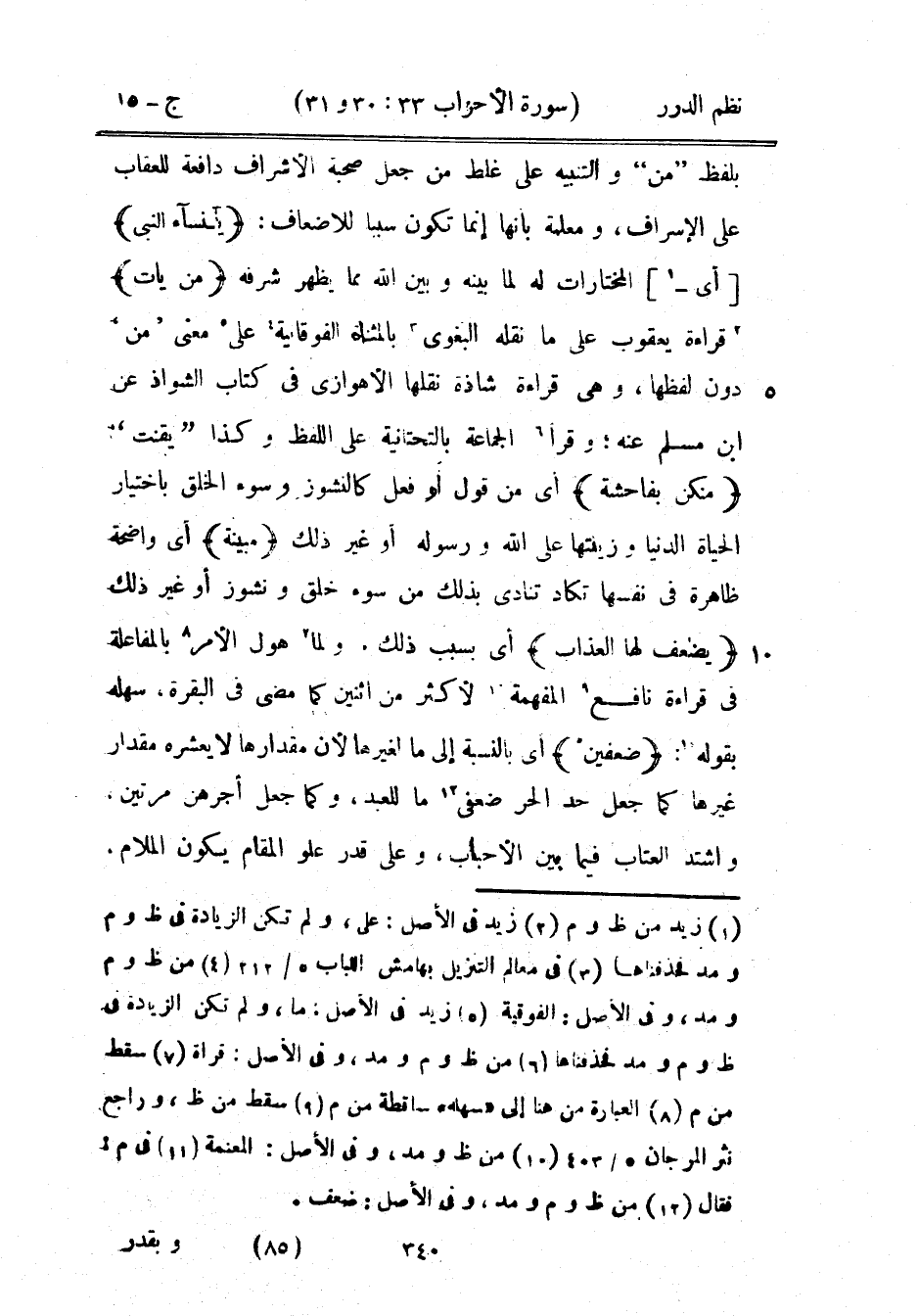 بلفظ «من» والتنبيه على غلط من جعل صحبه الأشراف دافعة للعقاب على الإسراف، ومعلمة بأنها إنما تكون سبباً للإضعاف: {يا نساء النبي} أي المختارات له لما بينه وبين الله مما يظهر شرفه {من يأتِ} قراءة يعقوب على ما نقله البغوي بالمثناة الفوقانية على معنى من دون لفظها وهي قراءة شاذة نقلها الأهوازي في كتاب الشواذ عن ابن مسلم عنه: وقرأ الجماعة بالتحتانية على اللفظ وكذا «يقنت» {منكن بفاحشة} أي من قول أو فعل كالنشوز وسوء الخلق باختيار الحياة الدنيا وزينتها على الله ورسوله أو غير ذلك {مبينة} أي واضحة ظاهرة في نفسها تكاد تنادي بذلك من سوء خلق ونشوز أو غير ذلك {يضاعف لها العذاب} أي بسبب ذلك، ولما هول الأمر بالمفاعلة في قراءة نافع المفهمة لأكثر من اثنين كما مضى في البقرة، سهله بقوله: {ضعفين} أي بالنسبة إلى ما لغيرها لأن مقدارها لا يعشره مقدار غيرها كما جعل حد الحر ضعفي ما للعبد، وكما جعل أجرهن مرتين.