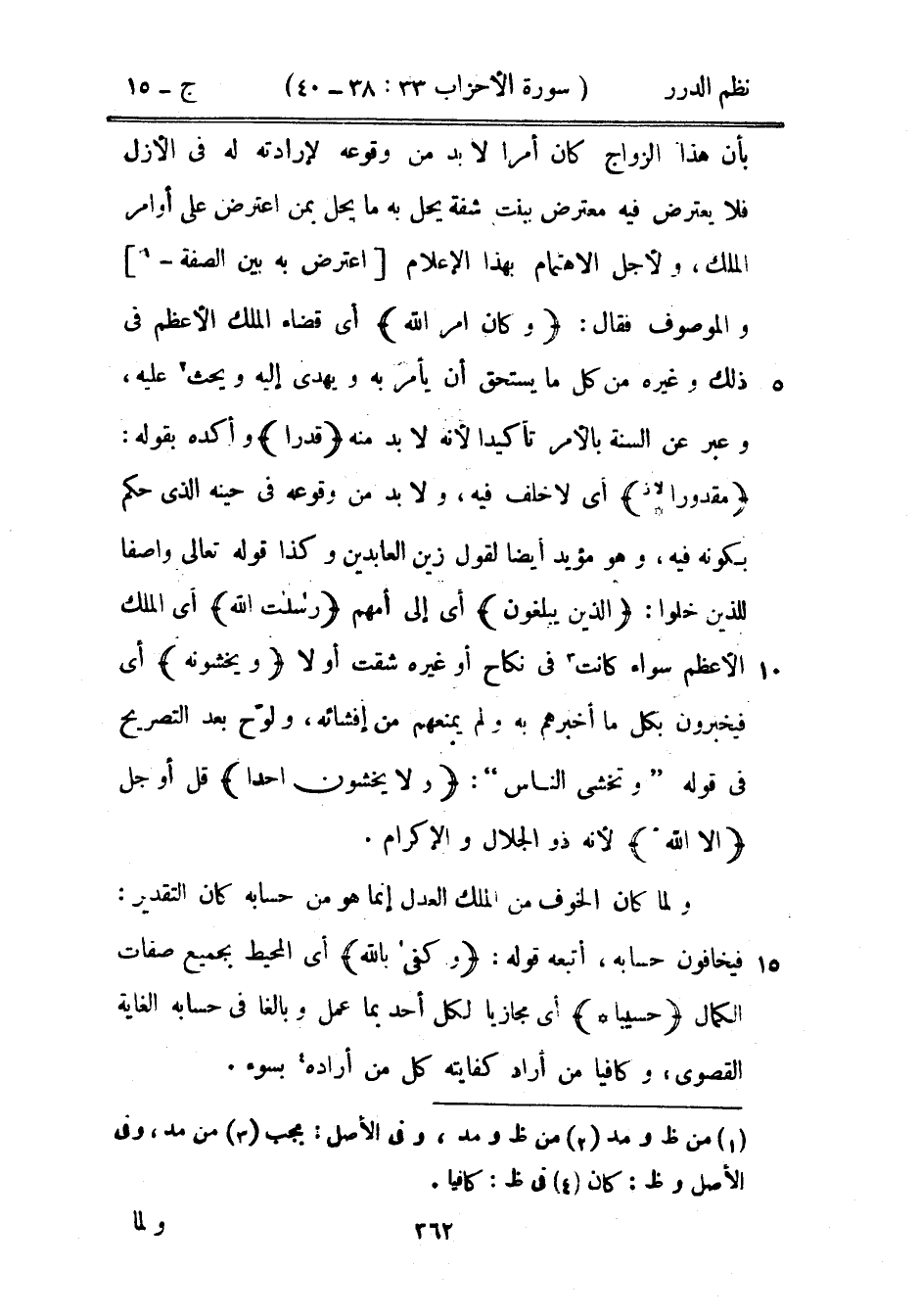 بأن هذا الزواج كان أمراً لا بد من وقوعه لإرادته له في الأزل فلا يعترض فيه معترض ببنت شفة يحل به ما يحل بمن اعترض على أوامر الملك، ولأجل الاهتمام بهذا الإعلام اعترض به بين الصفة الموصوف فقال: {وكان أمر الله} أي قضاء الملك الأعظم في ذلك وغيره من كل ما يستحق أن يأمر به ويهدي إليه ويحث عليه، وعبر عن السنة بالأمر تأكيداً لأنه لا بد منه {قدراً} وأكده بقوله: {مقدوراً} أي لا خلف فيه، ولا بد من وقوعه في حينه الذي حكم بكونه فيه، وهو مؤيد أيضاً لقول زين العابدين وكذا قوله تعالى واصفاً للذين خلوا: {الذين يبلغون} أي إلى أمهم {رسالات الله} أي الملك الأعظم سواء كانت في نكاح أو غيره شقت أو لا {ويخشونه} أي فيخبرون بكل ما أخبرهم به ولم يمنعهم من إفشائه، ولوّح بعد التصريح في قوله {وتخشى الناس} : {ولا يخشون أحداً} قلَّ أو جلَّ {إلا الله} لأنه ذو الجلال والإكرام.
