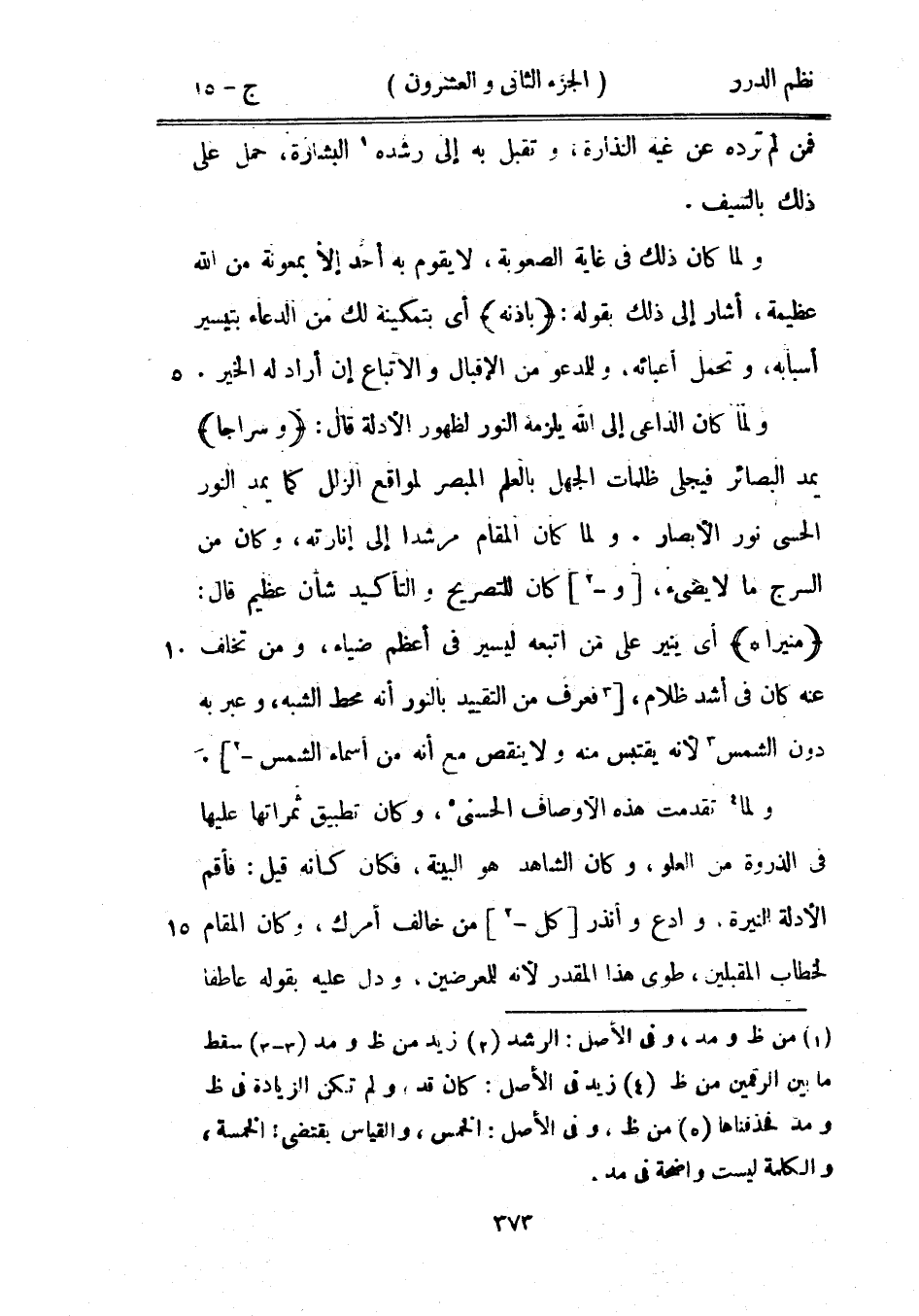 ولما كان الداعي إلى الله يلزمه النور لظهور الأدلة قال: {وسراجاً} يمد البصائر فيجلي ظلمات الجهل بالعلم المبصر لمواقع الزلل كما يمد النور الحسي نور الأبصار. ولما كان المقام مرشداً إلى إنارته، وكان من السرج ما لا يضيء، وكان للتصريح والتأكيد شأن عظيم قال: {منيراً *} أي ينير على من أتبعه ليسير في أعظم ضياء، ومن تخلف عنه كان في أشد ظلام، فعرف من التقييد بالنور أنه محط الشبه، وعبر به دون الشمس لأنه يقتبس منه ولا ينقص مع أنه من أسماء الشمس.