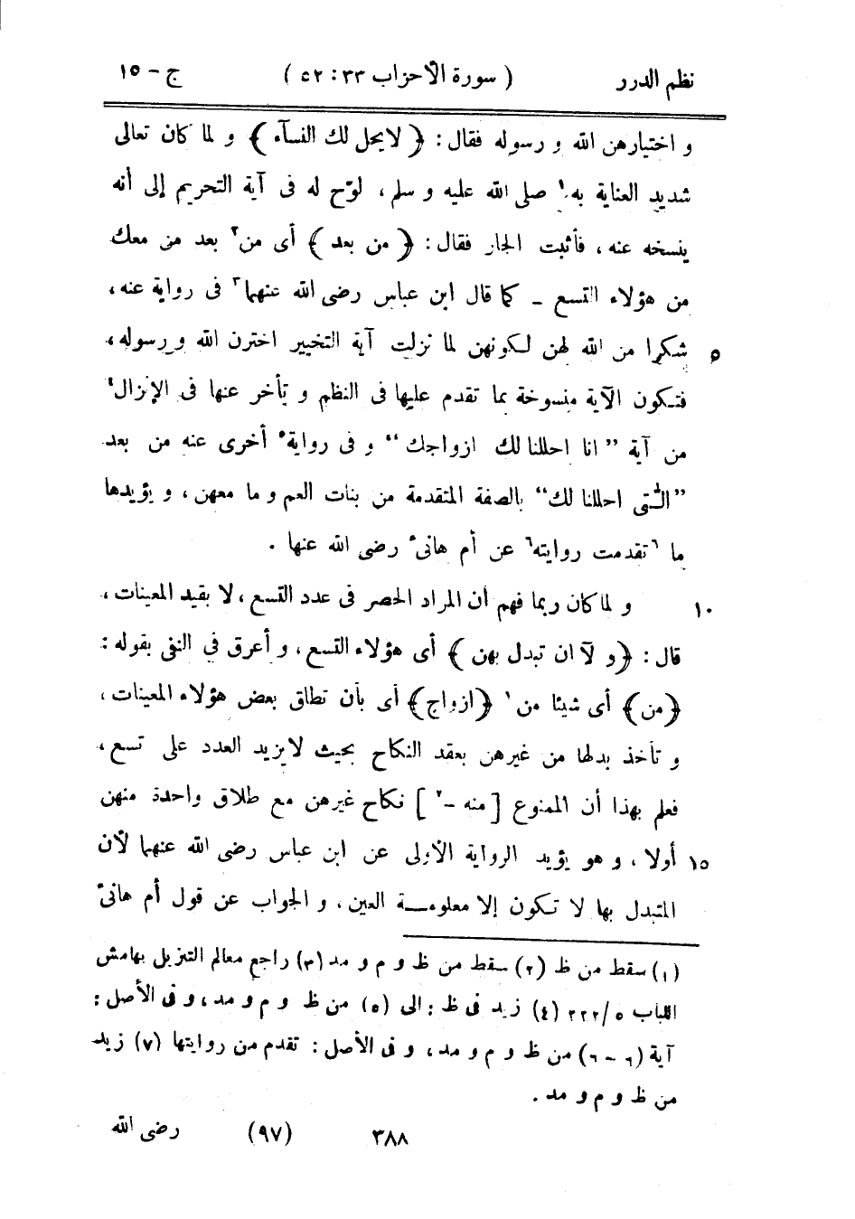 واختيارهن الله ورسوله فقال: {لا يحل لك النساء} ولما كان تعالى شديد العناية به صَلَّى اللهُ عَلَيْهِ وَسَلَّمَ لوّح له في آية التحريم إلى أنه ينسخه عنه، فأثبت الجار فقال: {من بعد} أي من بعد من معك من هؤلاء التسع - كما قال ابن عباس رضي الله عنهما في رواية عنه، شكراً من الله لهن لكونهن لما نزلت آية التخيير اخترن الله ورسوله، فتكون الآية منسوخة بمت تقدم عليها في النظم وتأخر عنها في الإنزال من آية {إنا أحللنا لك أزواجك} وفي رواية أخرى من بعد {اللاتي أحللنا لك} بالصفة المتقدمة من بنات العم وما معهن، ويؤيدها ما تقدمت روايته عن أم هانئ رضي الله عنها.