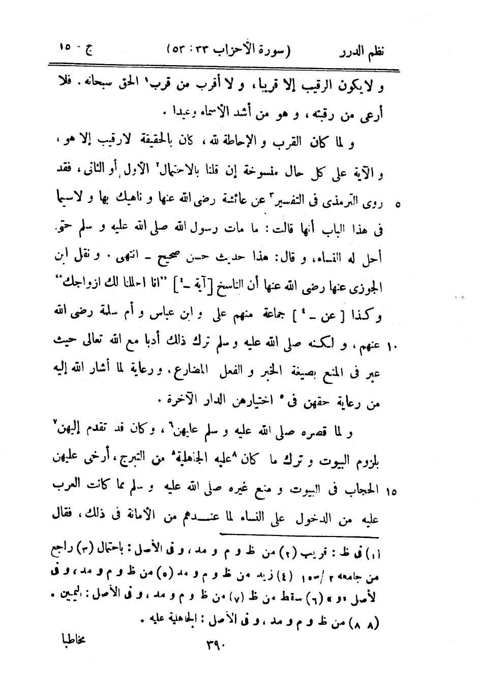 ولما كان القرب والإحاطة لله، كان بالحقيقة لا رقيب إلا هو، والآية على كل حال منسوخة إن قلنا بالاحتمال الأول أو الثاني، فقد روى الترمذي في التفسير عن عائشة رضي الله عنها وناهيك بها ولا سيما في هذا الباب أنها قالت: ما مات رسول الله صَلَّى اللهُ عَلَيْهِ وَسَلَّمَ حتى أحل له النساء، وقال: هذا حديث حسن صحيح - انتهى. ونقل ابن الجوزي عنها رضي الله عنها أن الناسخ آية {أنا أحللنا لك أزواجك} وكذا عن جماعة منهم علي وابن عباس وأم سلمة رضي الله عنهم، ولكن صَلَّى اللهُ عَلَيْهِ وَسَلَّمَ ترك ذلك أدباً مع الله تعالى حيث عبر في المنع بصيغة الخبر والفعل المضارع، ورعاية أشار الله إليه من رعاية حقهن في اختيارهن من الدار الآخرة.