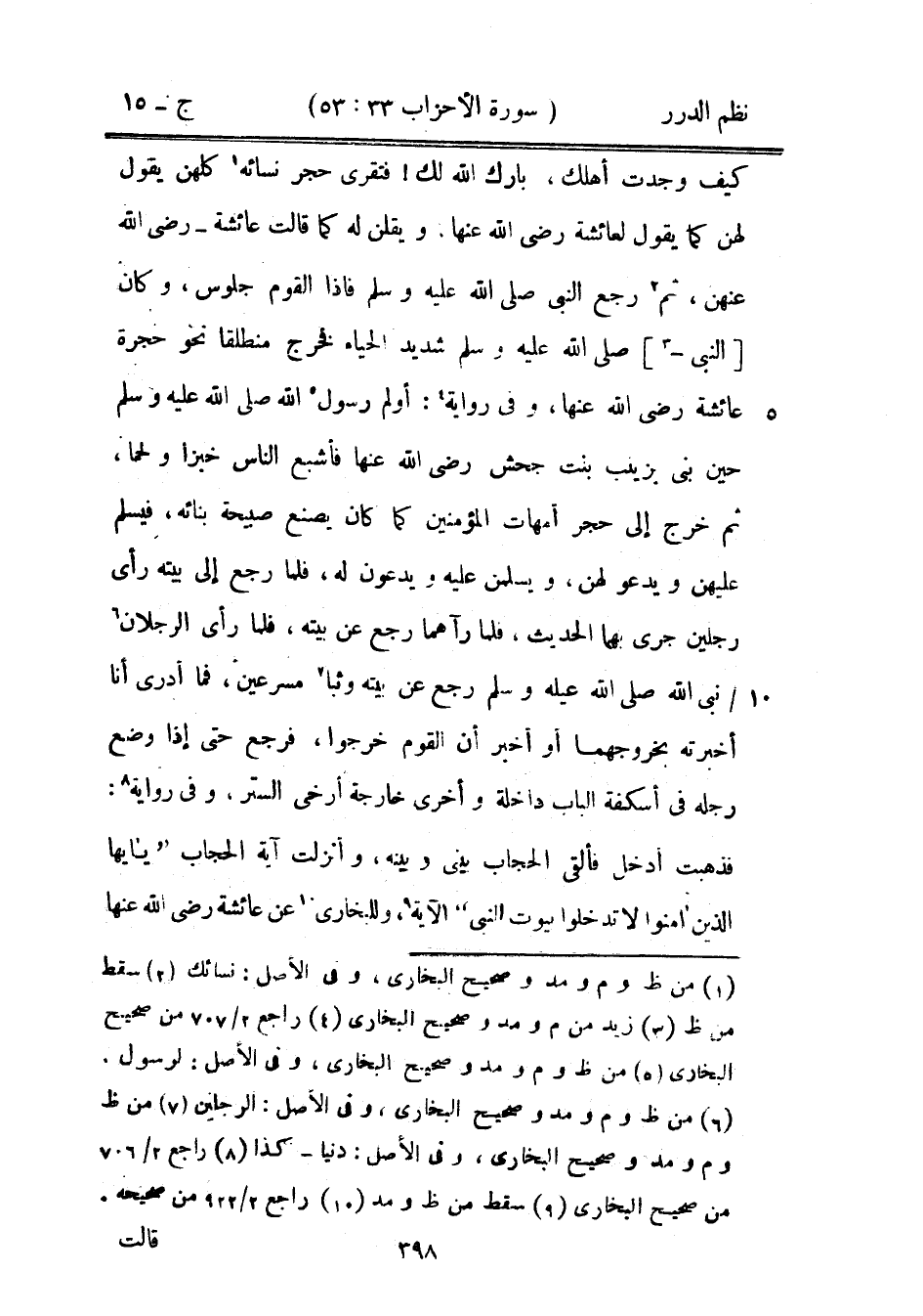 كيف وجدت أهلك، بارك الله لك! فتقرى حجر نسائه كلهن يقول لهن كما يقول لعائشة رضي الله عنها. ويقلن له كما قالت عائشة - رضي الله عنهن، ثم رجع النبي صَلَّى اللهُ عَلَيْهِ وَسَلَّمَ فإذا القوم جلوس، وكان النبي صَلَّى اللهُ عَلَيْهِ وَسَلَّمَ شديد الحياء فخرج منطلقاً، نحو حجرة عائشة رضي الله عنها، وفي رواية: أولم رسول الله صَلَّى اللهُ عَلَيْهِ وَسَلَّمَ حين بنى بزينب بنت جحش رضي الله عنها فأشبع الناس خبزاً ولحماً، ثم خرج إلى حجر أمهات المؤمنين كما كان يصنع صبيحة بنائه، فيسلم عليهن ويدعو لهن، ويسلمن عليه ويدعون له، فلما رجع إلى بيته رأى رجلين جرى بهما الحديث، فلما رآهما رجع عن بيته، فلما رأى الرجلان نبي الله صَلَّى اللهُ عَلَيْهِ وَسَلَّمَ رجع عن بيته وثبا مسرعين، فما أدري أنا أخبرته بخروجهما أو أخبر أن القوم خرجوا، فرجع حتى إذا وضع رجله في أسكفة الباب داخلة وأخرى خارجة أرخى الستر، وفي رواية: فذهبت أدخل فألقى الحجاب بيني وبينه، وأنزلت آية الحجاب {يا أيها الذين آمنوا لا تدخلوا بيوت النبي} الآية، وللبخاري عن عائشة رضي الله عنها
