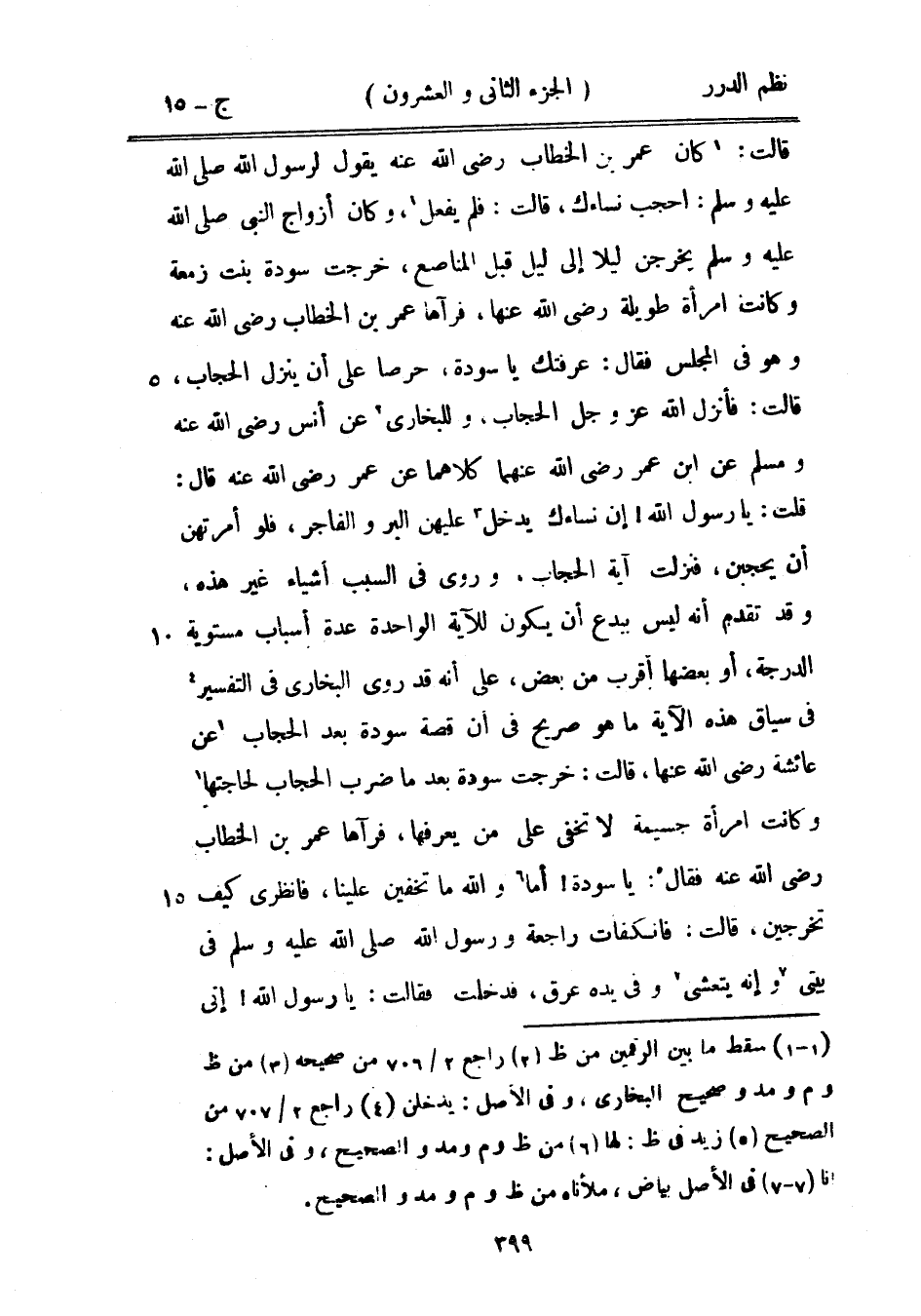 قالت: كان عمر بن الخطاب رضي الله عنه يقول لرسول الله صَلَّى اللهُ عَلَيْهِ وَسَلَّمَ: احجب نساءك قالت: فلم يفعل، وكان أزواج النبي صَلَّى اللهُ عَلَيْهِ وَسَلَّمَ يخرجن ليلاً إلى ليل قبل المناصع، خرجت سودة بنت زمعة وكانت امرأة طويلة رضي الله عنها، فرآها عمر بن الخطاب رضي الله عنه وهو في المجلس فقال: عرفتك يا سودة، حرصاً على أن ينزل الحجاب، قالت: فأنزل الله عز وجل الحجاب وللبخاري عن أنس رضي الله عنه ومسلم عن ابن عمر رضي الله عنهما كلاهما عن عمر رضي الله عنه قال: قلت: يا رسول الله! إن نساءك يدخل عليهن البر والفاجر، فلو أمرتهن أن يتحجبن، فنزلت آية الحجاب، وروي في السبب أشياء غير هذه، وقد تقدم أنه ليس ببدع أن يكون للآية الواحدة عدة أسباب مستوية الدرجة، أو بعضها أقرب من بعض، على أنه قد روى البخاري في التفسير في سياق هذه الآية ما هو صريح في أن قصة سودة بعد الحجاب عن عائشة رضي الله عنها، قالت: خرجت سودة بعد ما ضرب الحجاب لحاجتها وكانت امرأة جسيمة لا تخفى على من يعرفها، فرآها عمر بن الخطاب رضي الله عنه فقال: يا سودة! أما والله ما تخفين علينا، فانظري كيف تخرجين، قالت: فانكفأت راجعة ورسول الله صَلَّى اللهُ عَلَيْهِ وَسَلَّمَ في بيتي وإنه يتعشى وفي يده عرق فدخلت فقالت: يا رسول الله! إني