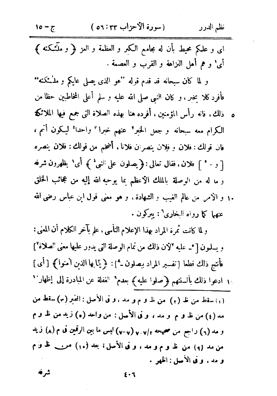 ولما كان سبحانه قد قدم قوله: {هو الذي يصلي عليكم وملائكته} فأفرد كلاً بخبر، وكان النبي صَلَّى اللهُ عَلَيْهِ وَسَلَّمَ أعلى المخاطبين حظاً فإنه رأس المؤمنين، أفرده هنا بهذه الصلاة التي جمع فيها الملائكة الكرام معه سبحانه وجعل الخبر عنهم خبراً واحداً ليكون أتم، فإن قولك: فلان وفلان ينصران فلاناً، أضخم من قولك: فلان ينصره وفلان، فقال تعالى: {يصلون على النبي} أي يظهرون شرفه وما له من الوصلة بالملك الأعظم بما يوحيه الله إليه من عجائب الخلق والأمر من عالم الغيب والشهادة، وهو معنى قول ابن عباس رضي الله عنهما كما رواه البخاري: «يبركون» .