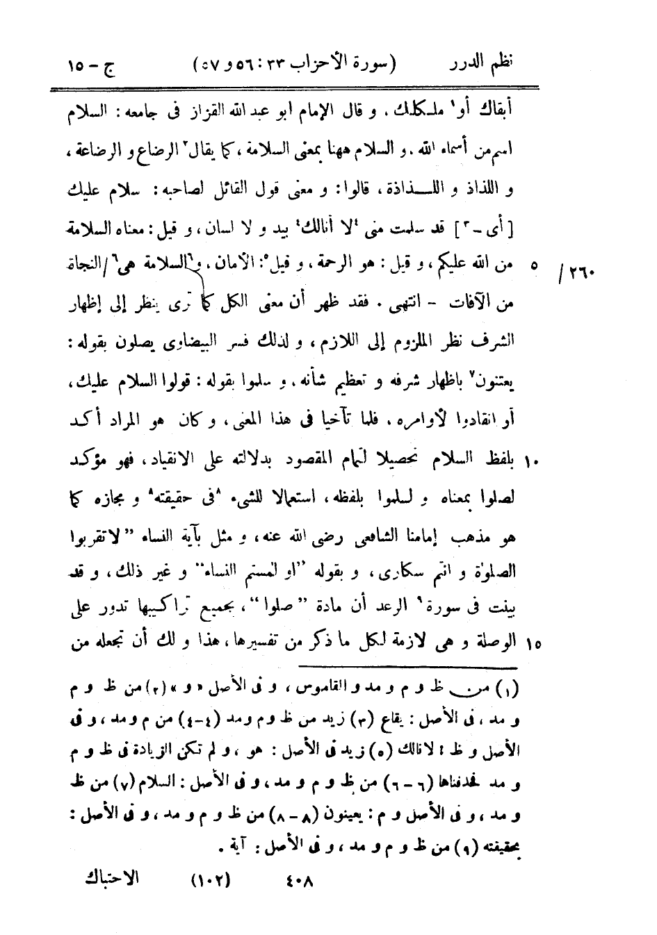 أبقاك أو ملكلك، وقال الإمام أبو عبد الله القزاز في جامعه: السلام اسم من أسماء الله، والسلام ههنا بمعنى السلامة، كما يقال الرضاع والرضاعة، واللذاذ واللذاذة، قالوا: ومعنى قول القائل لصاحبه: سلام عليك أي قد سلمت مني لا أنالك بيد ولا لسان، وقيل: معناه السلامة من الله عليكم، وقيل: هو الرحمة، وقيل: الأمان، والسلامة هي النجاة من الآفات - انتهى. فقد ظهر أن معنى الكل كما ترى ينظر إلى إظهار الشرف نظر الملزوم إلى اللازم، ولذلك فسر البيضاوي يصلون بقوله: يعنتون بإظهار شرفه وتعظيم شأنه، وسلموا بقوله: قولوا السلام عليك، أو انقادوا لأوامره، فلما تآخيا في هذا المعنى، وكان هو المراد أكد بلفظ السلام تحصيلاً لتمام المقصود بدلالته على الانقياد فهو مؤكد لصلوا بمعناه ولسلموا بلفظه، استعمالاً للشيء في حقيقته ومجازه كما هو مذهب إمامنا الشافعي رضي الله عنه، ومثل بآية النساء