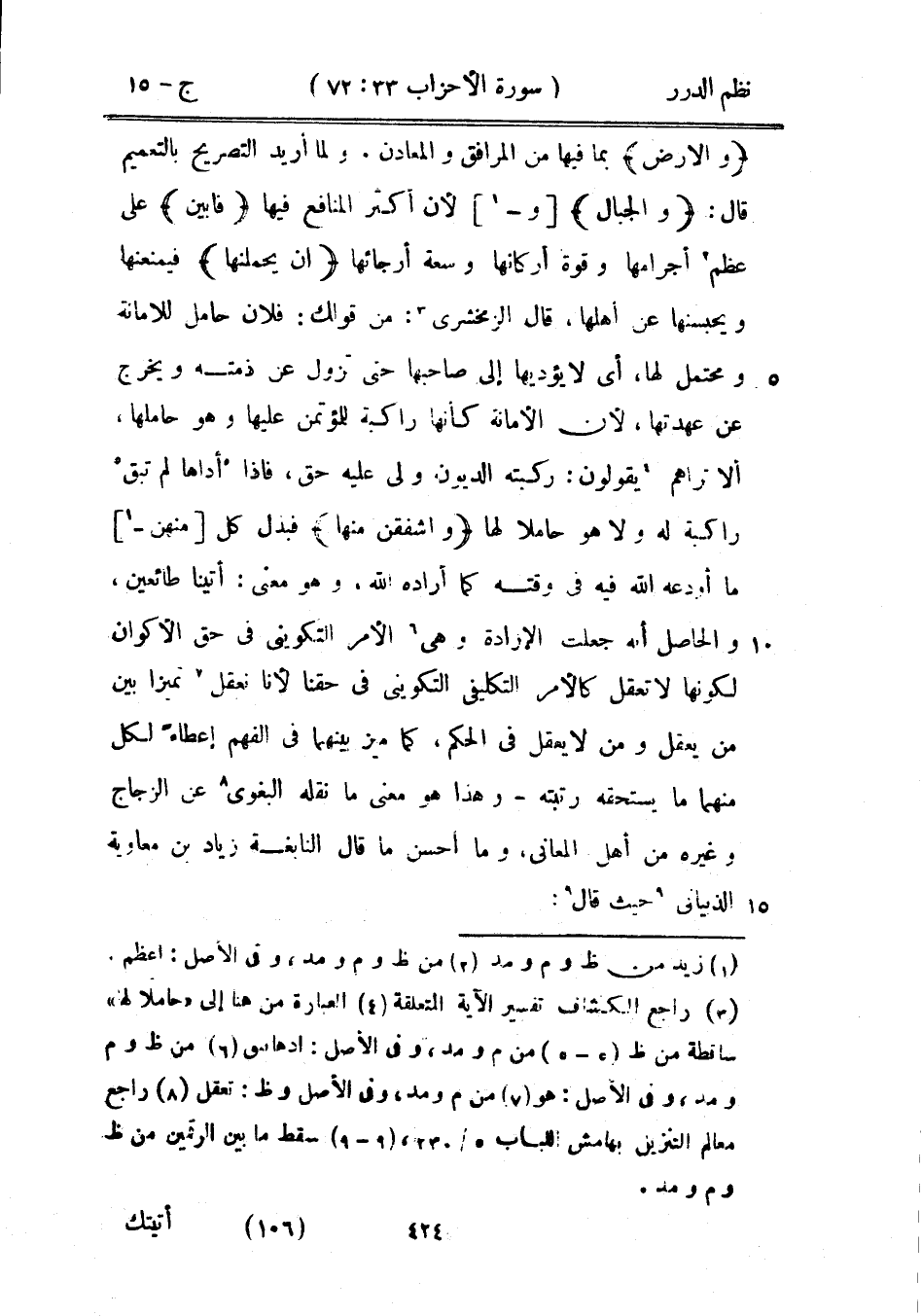 {والأرض} بما فيها من المرافق والمعادن. ولما أريد التصريح بالتعميم قال: {والجبال} ولأن أكثر المنافع فيها {فأبين} على عظم أجرامها وقوة أركانها وسعة أرجائها {أن يحملنها} فيمنعها ويحبسنها عن أهلها، قال الزمخشري: من قولك: فلان حامل للأمانة ومحتمل لها، أي لا يؤديها إلى صاحبها حتى تزول عن ذمته ويخرج عن عهدتها، لأن الأمانة كأنها راكبة للمؤتمن عليها وهو حاملها، ألا تراهم يقولون: ركبته الديون ولي عليه حق، فإذا أداها لم تبق راكبة له ولا هو حاملاً لها {وأشفقن منها} فبدل كل منهن ما أودعه الله فيه في وقته كما أراده الله، وهو معنى: أتينا طائعين، والحاصل أنه جعلت الإرادة وهي الأمر التكويني في حق الأكوان لكونها لا تعقل كالأمر التكليفي التكويني في حقنا لأنا نعقل تمييزاً بين من يعقل ومن لا يعقل في الحكم، كما ميز بينهما في الفهم إعطاءً لكل منهما ما يستحقه رتبته - وهذا هو معنى ما نقله البغوي عن الزجاج وغيره من أهل المعاني، وما أحسن ما قاله النابغة زياد بن معاوية الذبياني حيث قال: