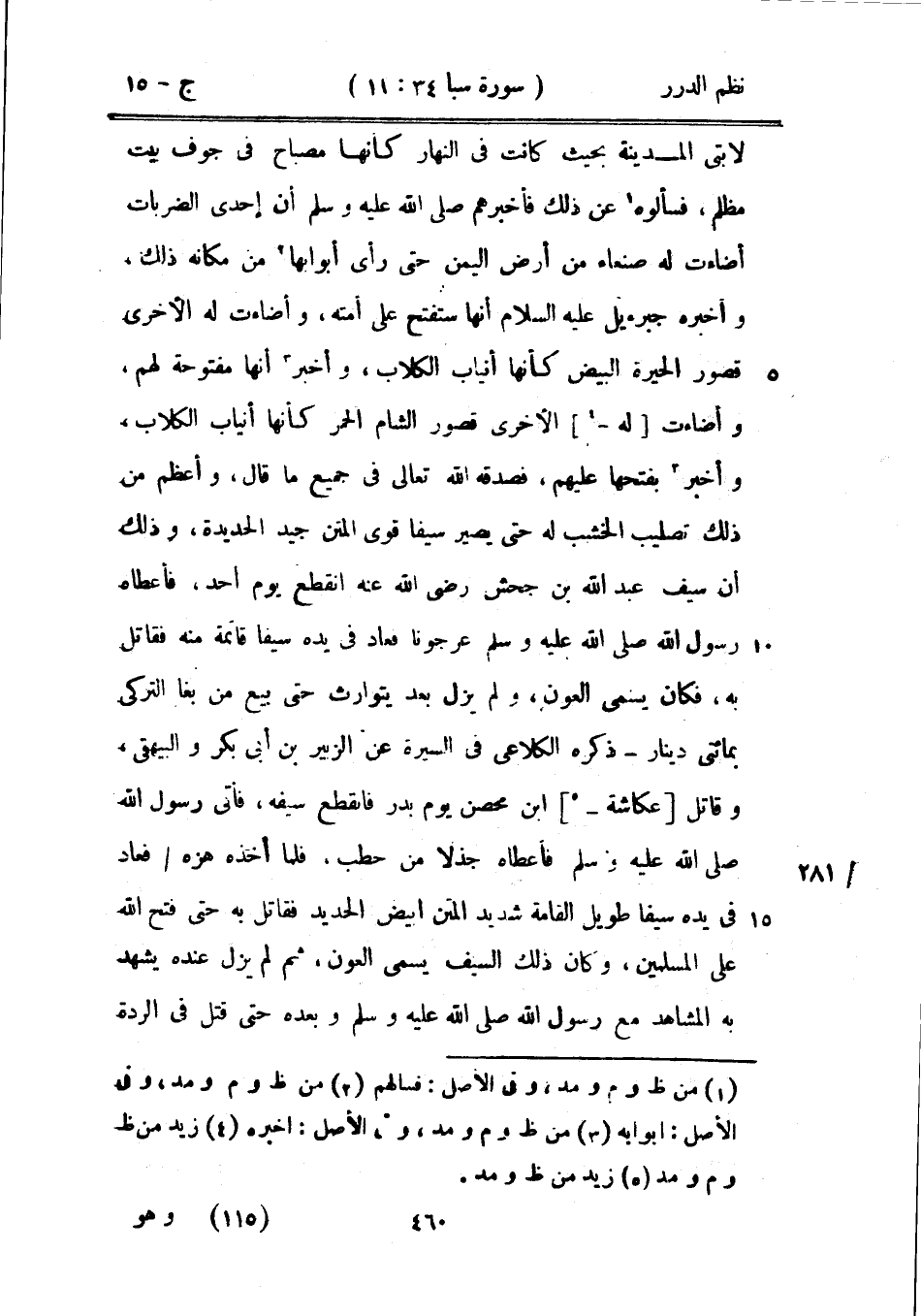 لابتي المدينة بحيث كانت في النهار كأنها مصباح في جوف بيت مظلم، فسألوه عن ذلك فأخبرهم صَلَّى اللهُ عَلَيْهِ وَسَلَّمَ أن إحدى الضربات أضاءت له صنعاء من أرض اليمن حتى رأى أبوابها من مكانه ذلك، وأخبره جبرائيل عيله السلام أنها ستفتح على أمته، وأضاءت له الأخرى قصور الحيرة البيض كأنها أنياب الكلاب، وأخبر أنها مفتوحة لهم، وأضاءت له الأخرى قصور الشام الحمر كأنها أنياب الكلاب، وأخبر بفتحها عليهم، فصدقه الله تعالى في جميع ما قال، وأعظم من ذلك تصليب الخشب له حتى يصير سيفاً قوي المتن جيد الحديدة، وذلك أن سيف عبد الله بن جحش رضي الله عنه انقطع يوم أحد، فأعطاه رسول الله صَلَّى اللهُ عَلَيْهِ وَسَلَّمَ عرجونا فعاد في يده سيفاً قائمة منه فقاتل به، فكان يسمى العون، ولم يزل بعد يتوارث حتى بيع من بغا التركي بمائتي دينار ذكره الكلاعي في السيرة عن الزبير بن أبي بكر والبيهقي، وقاتل عكاشة بن محصن يوم بدر فانقطع سيفه، فأتى رسول الله صَلَّى اللهُ عَلَيْهِ وَسَلَّمَ فأعطاه جذلاً من حطب، فلما أخذه هزه فعاد في يده سيفاً طويل القامة شديد المتن أبيض الحديد فقاتل به حتى وفتح الله على المسلمين، وكان ذلك السيف يسمى العون، ثم لم يزل عنده يشهد به المشاهد مع رسول الله صَلَّى اللهُ عَلَيْهِ وَسَلَّمَ وبعده حتى قتل في الردة