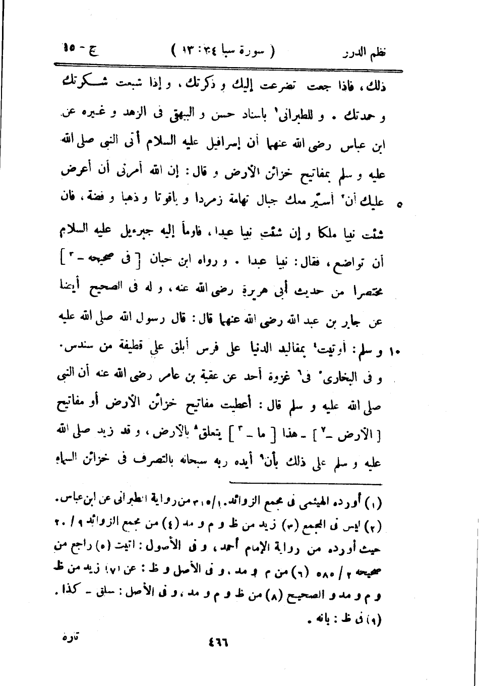 رواه ابن حبان في صحيحه مختصراً من حديث أبي هريرة رضي الله عنه، وله في الصحيح أيضاً عن جابر بن عبد الله عنهما قال: قال رسول الله صَلَّى اللهُ عَلَيْهِ وَسَلَّمَ «أوتيت بمقاليد الدنيا على فرس أبلق على قطيفة من سندس» وفي البخاري في غزوة أحد عن عقبة بن عامر رضي الله عنه أن النبي صَلَّى اللهُ عَلَيْهِ وَسَلَّمَ قال: «أعطيت مفاتيح خزائن الأرض أو مفاتيح» الأرض هذا ما يتعلق بالأرض، وقد زيد صَلَّى اللهُ عَلَيْهِ وَسَلَّمَ على ذلك بأن أيده ربه سبحانه بالتصرف في خزائن السماء
