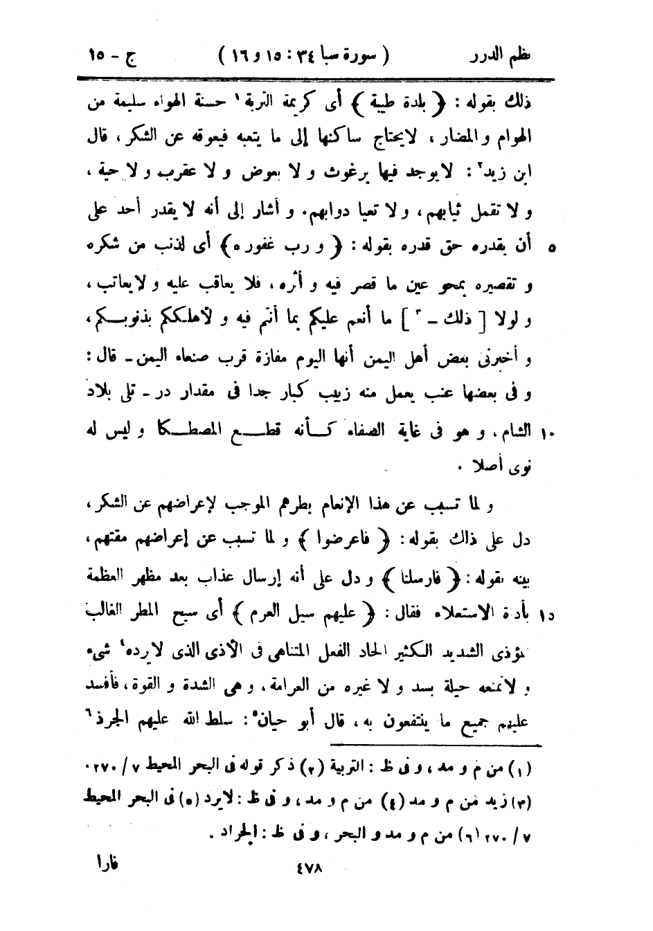 ذلك بقوله: {بلدة طيبة} أي كريمة التربة حسنة الهواء سليمة من الهوام والمضمار لا يحتاج ساكنها إلى ما يتبعه فيعوقه عن الشكر، قال ابن زيد: لا يوجد فيها برغوث ولا بعوض ولا عقرب ولا حية، ولا تقمل ثيابهم، ولا تعيا دوابهم. وأشار إلى أنه لا يقدر أحد على أن يقدره حق قدره بقوله: {ورب غفور *} أي لذنب من شكره وتقصيره بمحو عين ما قصر فيه وأثره فلا يعاقب عليه ولا يعاتب، ولولا ذلك ما أنعم عليكم بما أنتم فيه ولأهلككم بذنوبكم، وأخبرني بعض أهل اليمن أنها اليوم مفازة قرب صنعاء اليمن - قال: في بعضها عنب يعمل منه زبيب كبار جداً في مقدار در - تلي بلاد الشام، وهو في غاية الصفاء كأنه قطع المصطكا وليس له نوى أصلاً.