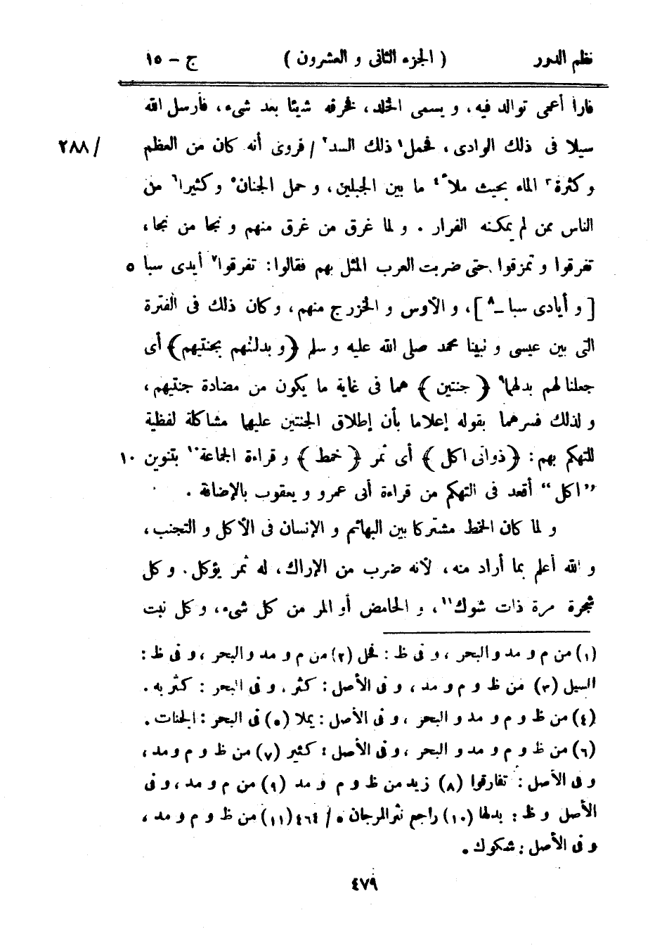 فاراً أعمى توالد فيه، ويسمى الخلد، فخرفه شيئاً بعد شيء، فأرسل الله سيلاً في ذلك الوادي، فحمل ذلك السد فروي أنه كان من العظم وكثرة الماء بحيث ملأ ما بين الجبلين، وحمل الجنان وكثيراً من الناس ممن لم يمكنه الفرار. ولما غرق من غرق منهم ونجا من نجا، تفرقوا وتمزقوا حتى ضربت العرب المثل بهم فقالوا: تفرقوا أيدي سبا وأيادي سبا، والأوس والخزرج منهم، وكان ذلك في الفترة التي بين عيسى ونبينا محمد صَلَّى اللهُ عَلَيْهِ وَسَلَّمَ {وبدلناهم بجنتيهم} أي جعلنا لهم بدلهما {جنتين} هما في غاية ما يكون من مضادة جنتيهم، ولذلك فسرهما بقوله إعلاماً بإن إطلاق الجنتين عليهما مشاكلة لفظية للتهكم بهم: {ذواتي أكل} أي ثمر {خمط} وقراءة الجماعة بتنوين {أكل} أقعد في التهكم من قراءة أبي عمرو ويعقوب بالإضافة.