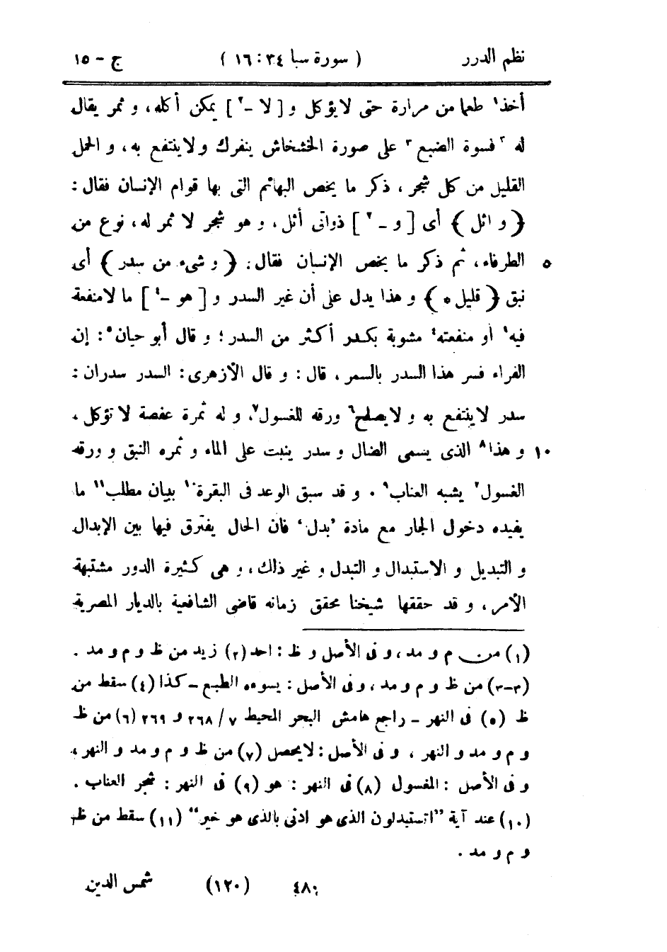 أخذ طعماً من مرارة حتى لا يؤكل، ولا يمكن أكله، وثمر يقال له فسوة الضبع على صورة الخشخاش ينفرك ولا ينتفع به، والحمل القليل من كل شجر، ذكر ما يخص البهائم التي بها قوام الإنسان فقال: {وأثل} أي وذواتي أثل، وهو شجر لا ثمر له، نوع من الطرفاء، ثم ذكر ما يخص الإنسان فقال: {وشيء من سدر} أي نبق {قليل *} وهذا يدل على أن غير السدر وهو ما لا منفعة فيه أو منفعته مشوبة بكدر أكثر من السدر؛ وقال أبو حيان: إن الفراء فسر هذا السدر بالسمر، قال: وقال الأزهري: السدر سدران: سدر لا ينتفع به ولا يصلح ورقه للغسول، وله ثمرة عفصة لا تؤكل، وهذا الذي يسمى الضال وسدر ينبت على الماء وثمره النبق وورقة الغسول يشبه العناب. وقد سبق الوعد في البقرة ببيان مطلب ما يفيده دخول الجار مع مادة «بدل» فإن الحال يفترق فيها بين الإبدال والتبديل والاستبدال والتبدل وغير ذلك، وهي كثرة الدور مشتبهة الأمر، وقد حققها شيخنا محقق زمانه قاضي الشافعية بالديار المصرية