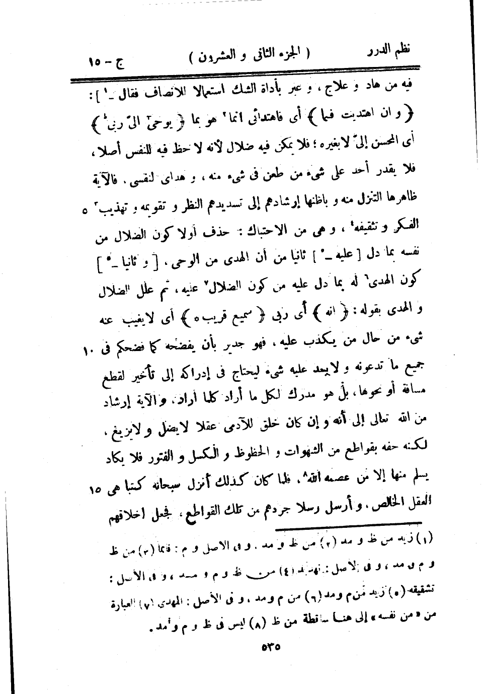 فيه من هاد وعلاج، وعبر بأداة الشك استعمالاً للأنصاف فقال: {وإن اهتديت فبما} أي فاهتدائي إنما هو بما {يُوحي إليَّ ربي} أي المحسن إليّ لا بغيره، فلا يمكن فيه ضلال لأنه لا حظ فيه للنفس أصلاً، فلا يقدر أحد على شيء من طعن في شيء منه، وهداي لنفسي، فالآية ظاهرها التنزل منه وباطنها إرشادهم إلى تسديدهم النظر وتقويمه وتهذيب الفكر وتثقيفه، وهي من الاحتباك: حذف أولاً كون الضلال من نفسه بما دل عليه ثانياً من أن الهدى من الوحي وثانياً كون الهدى له بما دل عليه من كون الضلال عليه ثم علل الضلال والهدى بقوله: {إنَّه} أي ربي {سميع قريب *} أي لا يغيب عنه شيء من حال من يكذب عليه، فهو جدير بأنه يفضحه كما فضحكم في جميع ما تدعونه ولا يبعد عليه شيء ليحتاج في إدراكه إلى تأخير لقطع مسافة أو نحوها، بل هو مدرك لكل ما أراد كلما أراد، والآية إرشاد من الله تعالى إلى أنه وإن كان خلق للآدمي عقلاً لا يضل ولا يزيغ، لكنه حفه بقواطع من الشهوات والحظوظ والكسل والفتور فلا يكاد يسلم منها إلا من عصمه الله، فلما كان كذلك أنزل سبحانه كتباً هي العقل الخالص، وأرسل رسلاً جردهم من تلك القواطع، فجعل أخلاقهم