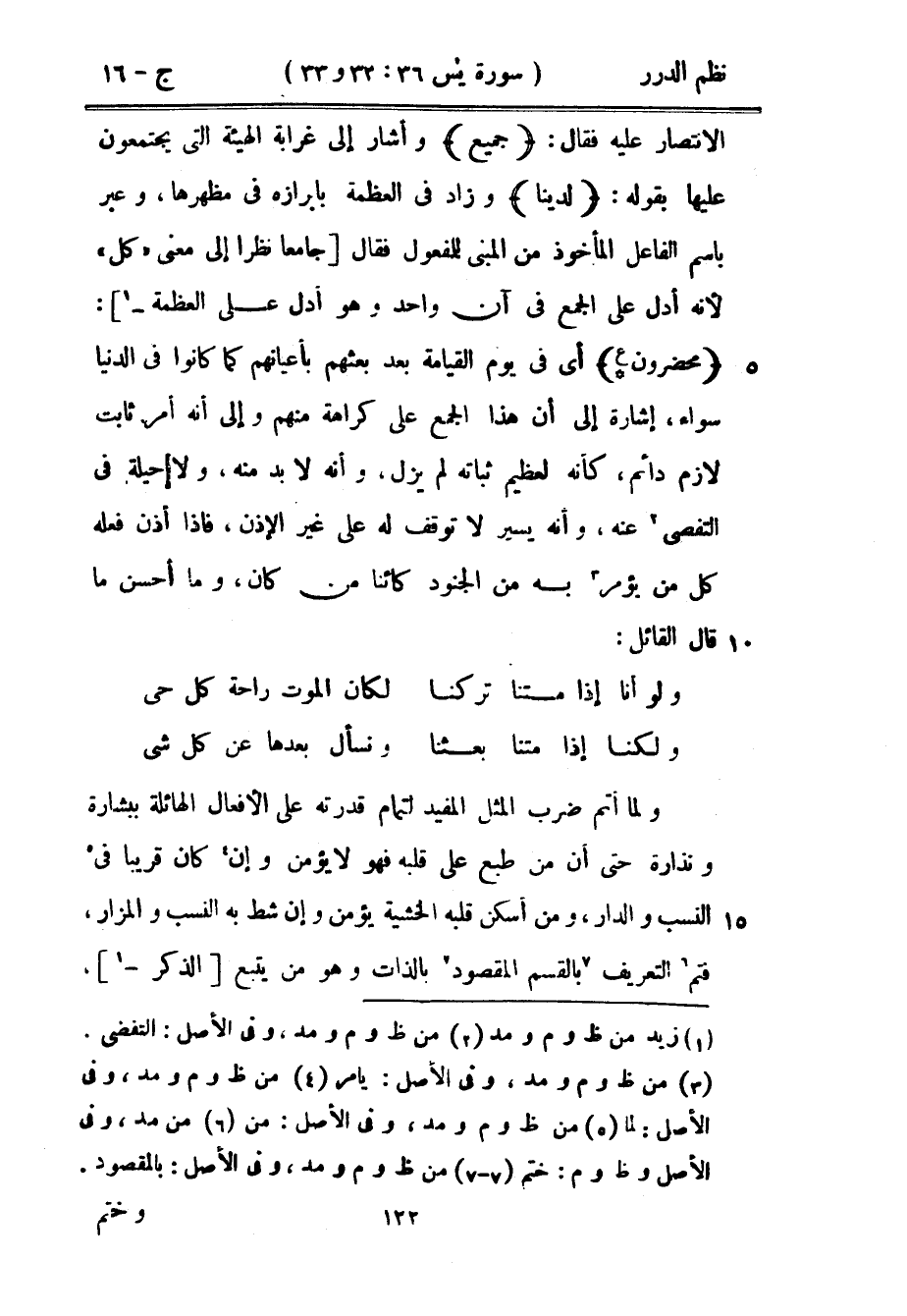 الانتصار عليه فقال: {جميع} وأشار إلى غرابة الهيئة التي يجتمعون عليها بقوله: {لدينا} وزاد في العظمة بإبرازه في مظهرها، وعبر باسم الفاعل المأخوذ من المبني للمفعول جامعاً نظراً إلى معنى {كل} لأنه أدل على الجمع في آن واحد وهو أدل على العظمة: {محضرون *} أي في يوم القيامة بعد بعثهم بأعيانهم كما كانوا في الدنيا سواء، إشارة إلى أن هذا الجمع على كراهة منهم وإلى أنه أمر ثابت لازم دائم، كأنه لعظيم ثباته لم يزل، وأنه لا بد منه، ولا حيلة في التفصي عنه، وأنه يسير لا توقف له غير الإذن، فإذا أذن فعله كل من يؤمر به من الجنود كائناً من كان، وما أحسن ما قال القائل: