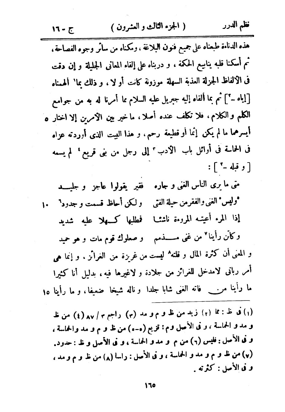 هذه الدناءة طبعناه على جميع فنون البلاغة، ومكناه من سائر وجوه الفصاحة، ثم أسكنا قلبه ينابيع الحكمة، ودربناه على إلقاء المعاني الجليلة وإن دقت في الألفاظ الجزلة العذبة السهلة موزونة كانت أو لا، وذلك بما ألهمناه إياه ثم بما ألقاه إليه جبريل عليه السلام مما أمرنا له به من جوامع الكلم والكلام، فلا تكلف عنده أصلاً، ما خير بين الأمرين إلا اختار أيسرهما ما لم يكن إثماً أو قطيعة رحم، وهذا البيت الذي أوردته عزاه في الحماسة في أوائل باب الأدب إلى رجل من بني قريع لم يسمه وقبله: