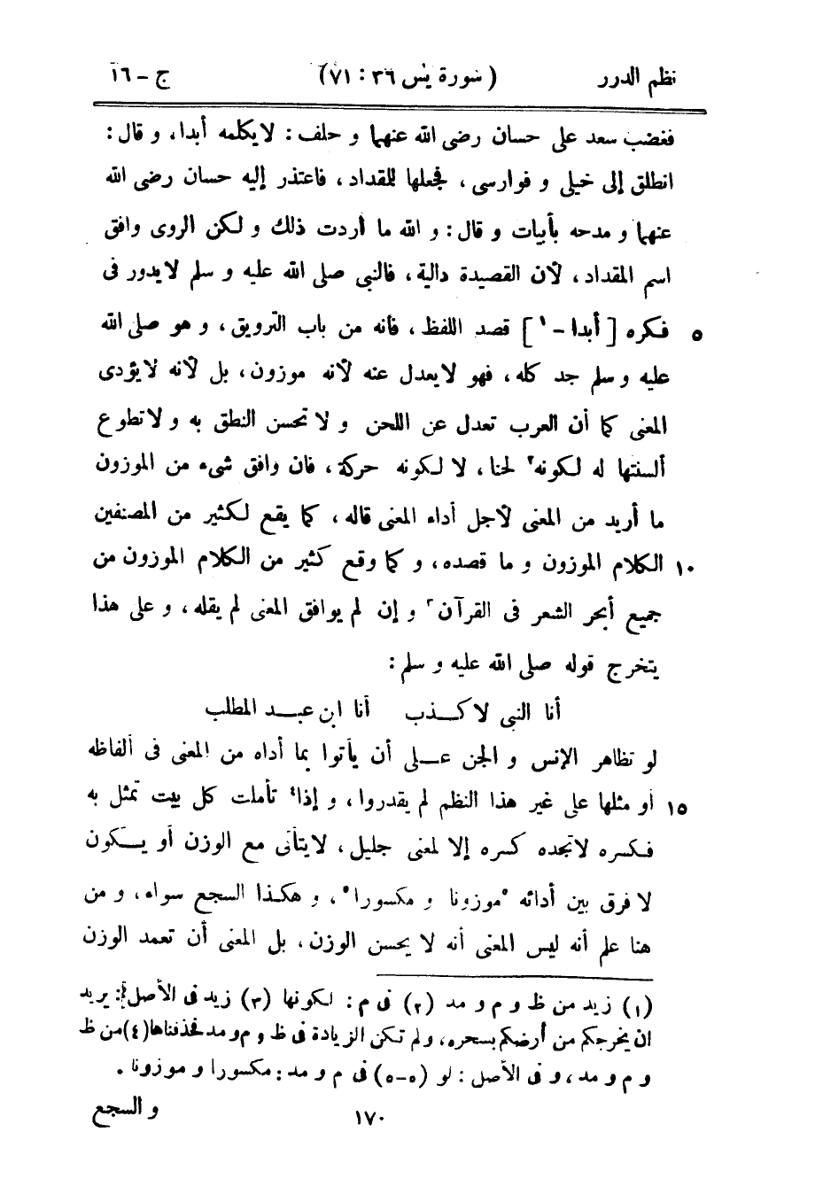 فغضب سعد على حسان رضي الله عنهما وحلف: لا يكلمه أبداً، وقال: انطلق إلى خيلي وفوارسي، فجعلها للمقداد، فاعتذر إليه حسان رضي الله عنهما ومدحه بأبيات وقال: والله ما أردت ذلك ولكن الروي وافق اسم المقداد، لأن القصيدة دالية، فالنبي صَلَّى اللهُ عَلَيْهِ وَسَلَّمَ لا يدور في فكره أبداً قصد اللفظ، فإنه من باب الترويق، وهو صَلَّى اللهُ عَلَيْهِ وَسَلَّمَ جد كله، فهو لا يعدل عنه لأنه موزون، بل لأنه لا يؤدي المعنى كما أن العرب تعدل عن اللحن ولا تحسن النطق به ولا تطوع ألسنتها له لكونه لحناً، لا لكونه حركة، فإن وافق شيء من الموزون ما أريد من المعنى لأجل أداء المعنى قاله، كما يقع لكثير من المصنفين الكلام الموزون وما قصده، وكما وقع كثير من الكلام الموزون من جميع أبحر الشعر في القرآن وإن لم يوافق المعنى لم يقله، وعلى هذا يتخرج قوله صَلَّى اللهُ عَلَيْهِ وَسَلَّمَ: