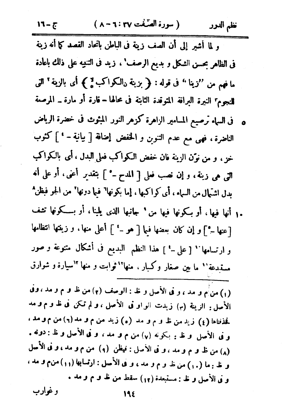 ولما أشير إلى أن الصف زينة في الباطن باتحاد القصد كما أنه زينة في الظاهر بحسن الشكل وبديع الرصف، زيد في التنبيه على ذلك بإعادة ما فهم من «زينا» في قوله: {بزينة الكواكب *} أي بالزينة التي للنجوم النيرة البراقة المتوقدة الثابتة في محالها - قارة أو مارة - المرصعة في السماء ترصيع المسامير الزاهرة كزهر النور المبثوث في خضرة الرياض الناضرة، فهي مع عدم التنوين والخفض إضافة بيانية كثوب خز، ومن نوّن الزينة فإن خفض الكواكب فعلى البدل، أي بالكواكب التي هي زينة، وإن نصب فعلى المدح بتقدير أعني، أو على أنه بدل اشتمال من السماء، أي كواكبها، إما بكونها فيما دونها من الجو فبظن أنها فيها، أو يكونها فيها من جانبها الذي يلينا، أو بكونها تشف عنها وإن كان بعضها فيما هو أعلى منها، وزينتها انتظامها وارتسامها على هذا النظم البديع في أشكال متنوعة وصور مستبدعة ما بين صغار وكبار، منها ثوابت ومنا سيارة وشوارق