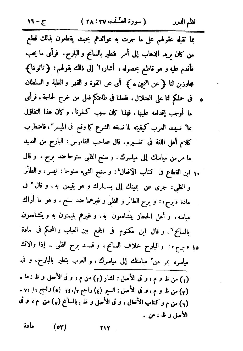بما تقبله عقولهم على ما جرت به عوائدهم بحيث يقطعون بذلك قطع من كان يريد الذهاب إلى أمر فتطير بالسانح والبارح، فرأى ما يحب فأقدم عليه وهو قاطع بحصوله، أشاروا إلى ذلك بقوله: {تأتوننا} مجاوزين لنا {عن اليمين *} أي عن القوة والقهر والغلبة والسلطان في حملكم لنا على الضلال، ففعلنا في طاعتكم فعل من خرج لحاجة، فرأى ما أوجب إقدامه عليها، فهذا كان سبب كفرنا، وكان هذا التفاؤل مما نسيت العرب كيفيته لما نسخه الشرع كما وقع في الميسر فاضطرب كلام أهل اللغة في تفسيره، قال صاحب القاموس: البارح من الصيد ما مر من ميامنك إلى مياسرك، وسنح الظبي سنوحاً ضد برح. وقال ابن القطاع في كتاب الأفعال: وسنح الشيء سنوحاً: تيسر، والطائر والظبي: جرى عن يمينك إلى يسارك وهو يتيمن به، وقال في مادة «برح» : وبرح الطائر والظبي وغيرهما ضد سنح، وهو ما أراك ميامنه، وأهل الحجاز يتشاءمون به، وغيرهم يتيمنون به ويتشاءمون بالسانح، وقال ابن مكتوم في الجمع بين العباب والمحكم في مادة «برح» : والبارح خلاف السانح، وقد برح الظبي - إذا والاك مياسره يمر من ميامنك إلى مياسرك، والعرب يتطير بالبارح وفي