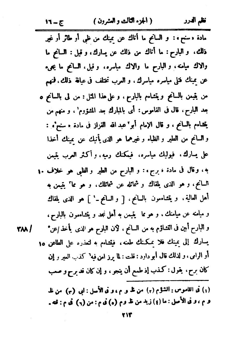 مادة «سنح» : والسانح ما أتاك عن يمينك من ظبي أو طائر أو غير ذلك والبارح: ما أتاك من ذلك عن يسارك وقيل: السانح ما والاك ميامنه والبارح ما والاك مياسره وقيل السانح ما يجيء عن يمينك فتلي مياسره مياسرك والعرب تختلف في عيافة ذلك، فمنهم من يتيمن بالسانح ويتشاءم بالبارح، وعلى هذا المثل: من لي بالسانح بعد البارح، قال في القاموس: أي بالمبارك بعد المشؤوم، ومنهم من يتشاءم بالسانح، وقال الإمام أبو عبد الله القزاز في مادة «سنح» : والسانح من الطير والظباء وغيرهما هو الذي يأتيك عن يمينك أخذاً على يسارك فيوليك مياسره فيمكنك رميه وأكثر العرب يتيمن به وقال في مادة «برح» : والبارح من الطير والظبي هو خلاف السانح وهو الذي يلقاك وشمائله عن شمائلك، وهو مما يتيمن به أهل العالية، ويتشاءمون بالسانح، والسانح هو الذي يلقاك وميامنه عن ميامنك، وهو مما يتيمن به أهل نجد ويتشاءمون بالبارح، والبارح أبين في التشاؤم من السانح، لأن البارح هو الذي يأخذ عن يسارك إلى يمينك فلا يمكنك طعنه، فيتشاءم به لتعذره على الطاعن أو الرامي، ولذلك قال أبو داود: قلت: لما برز أمن فيه كذب العير وإن كان برح، يقول: كذب إذ طمع أن ينجو، وإن كان قد برح وصعب