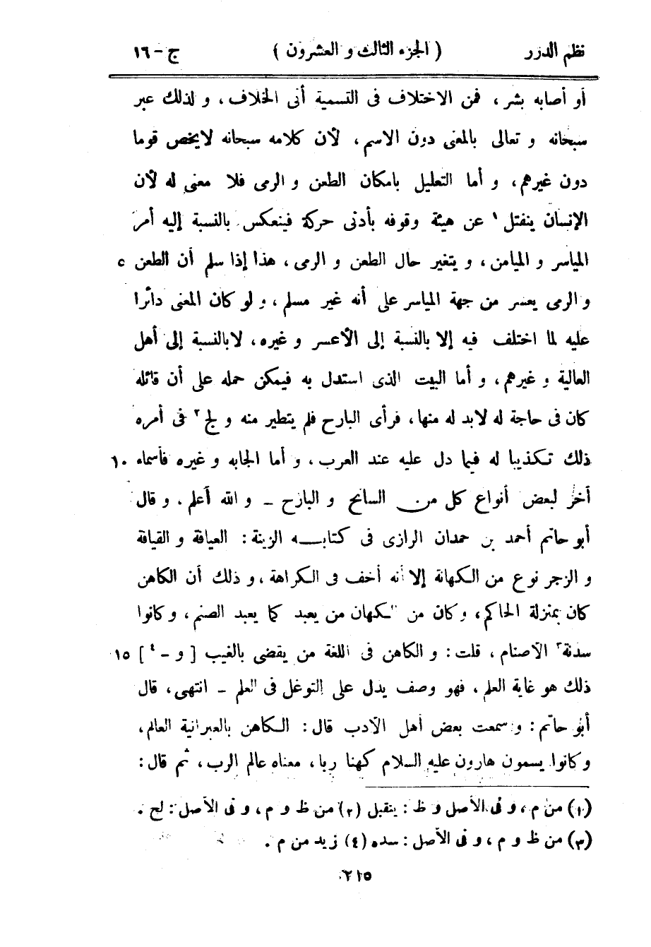 أو أصابه بشر، فمن الاختلاف في التسمية أتى الخلاف، ولذلك عبر سبحانه وتعالى بالمعنى دون الاسم، لأن كلامه سبحانه لا يخص قوماً دون غيرهم، وأما التعليل بإمكان الطعن والرمي فلا معنى له لأن الإنسان ينفتل عن هيئة وقوفه بأدنى حركة فينعكس بالنسبة إليه أمر المياسر والميامن، ويتغير حال الطعن والرمي، هذا إذا سلم أن الطعن والرمي يعسر من جهة المياسر على أنه غير مسلم، ولو كان المعنى دائراً عليه لما اختلف فيه إلا بالنسبة إلى الأعسر وغيره، لا بالنسبة إلى أهل العالية وغيرهم، وأما البيت الذي استدل به فيمكن حمله على أن قائله كان في حاجة له لا بد له منها، فرأى البارح فلم يتطير منه ولج في أمره ذلك تكذيباً له فيما دل عليه عند العرب، وأما الجابه وغيره فأسماء أخر لبعض أنواع كل من السانح والبارح - والله أعلم، وقال أبو حاتم أحمد بن حمدان الرازي في كتابه الزينة: العيافة والقيافة والزجر نوع من الكهانة إلا أنه أخف في الكراهة وذلك أن الكاهن كان بمنزلة الحاكم وكان من الكهان من يعبد كما يعبد الصنم، وكانوا سدنة الأصنام، قلت: والكاهن في اللغة من يقضي بالغيب وذلك هو غاية العلم، فهو وصف يدل على التوغل في العلم - انتهى، قال أبو حاتم: وسمعت بعض أهل الأدب قال: الكاهن بالعبرانية العالم، وكانوا يسمون هارون عليه السلام كهناً رباً، معناه عالم الرب، ثم قال: